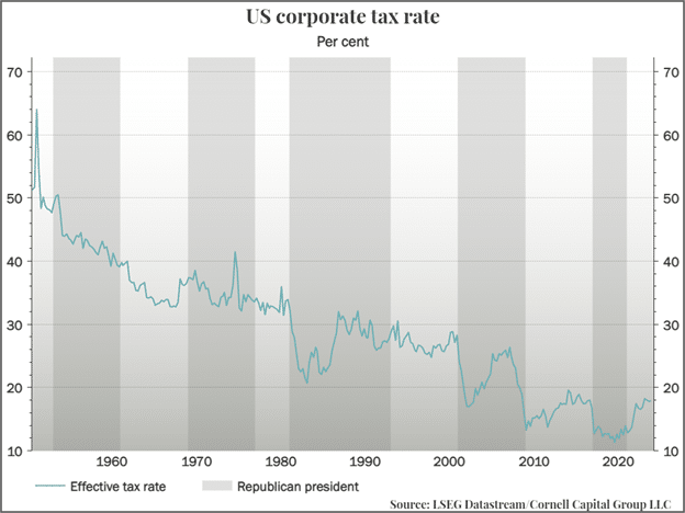 A big reason for the rise is corporate profits since 1980 are three big cuts in the corporate tax rates enacted during the administrations of Presidents Reagan, Bush, and Trump. The final cut by the Trump administration reduced rates a seventy-year low. Recently, however, political winds have begun to change, During the Biden administration effective corporate tax rates have risen and there is an active debate in Washington regarding further increases. Whether or not that occurs it is hard to imagine corporate rates being cut again, even if Trump is elected once again.