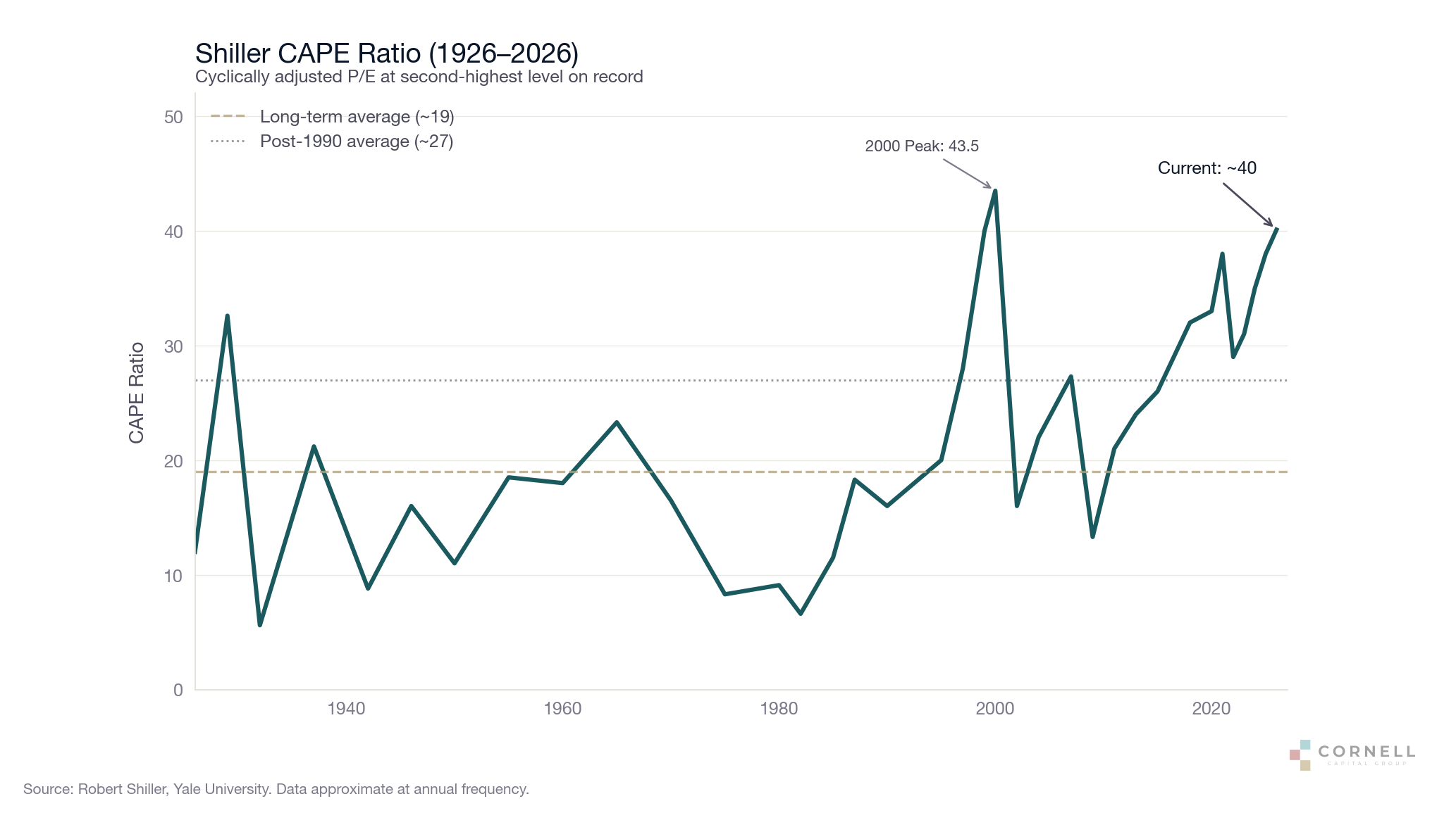 In a previous commentary, we argued that the equity risk premium had structurally declined — reflecting better regulation, improved monetary policy, and the demonstrated willingness of governments to backstop crises. That argument still holds. But there is a difference between a lower risk premium and an inadequate one. As of early 2026, the S&P 500 traded at a Shiller CAPE near 40 — among the highest levels in history.