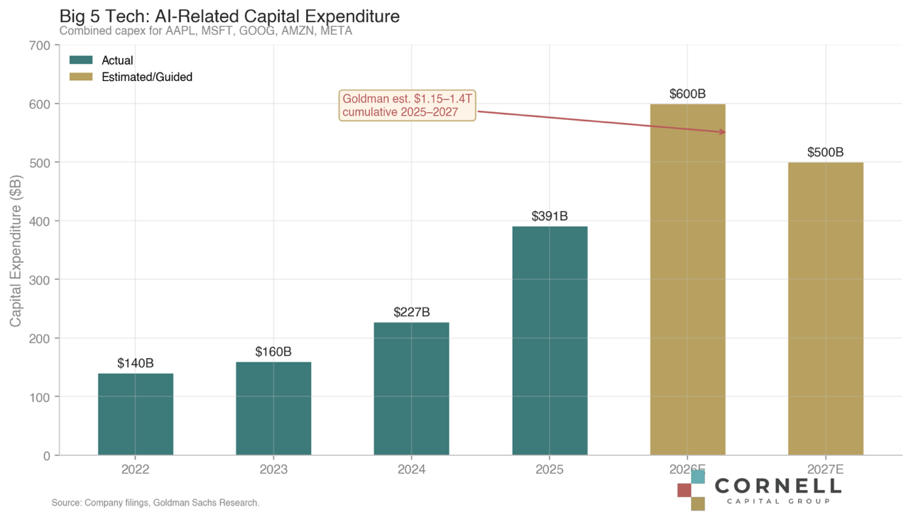 Meanwhile, the trajectory of AI capital spending remains a first-order risk to the mega-cap stocks that dominate the index. The five largest U.S. tech companies increased capex from roughly $227 billion in 2024 to $391 billion in 2025, with guidance pointing toward more than $600 billion in 2026. Each firm feels it must invest to avoid falling behind, but when all invest simultaneously the likely outcome is margin compression rather than durable competitive advantage. History — from fiber optics in the 1990s to railroads before that — suggests that transformative infrastructure often creates enormous social value while destroying investor capital. For a more detailed analysis, see our companion publication on this topic: The AI Prisoner’s Dilemma.