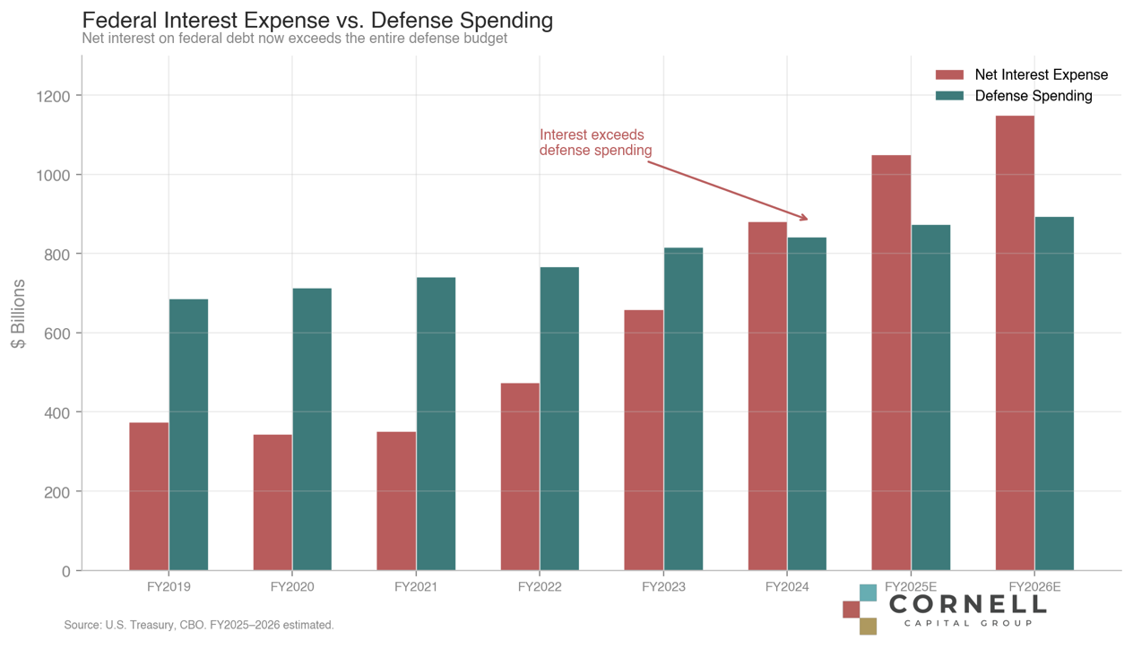 The federal government’s fiscal position continues to deteriorate. The CBO projects a $1.9 trillion deficit in fiscal 2026, with federal debt at 101% of GDP and net interest payments reaching $1 trillion annually — exceeding the entire defense budget. As we have argued in previous memos, persistent fiscal deficits have acted as a powerful tailwind for corporate earnings and stock prices, but ever-rising government debt brings with it higher interest costs and growing refinancing risk. At some point, the bond market may demand a higher price for absorbing that supply, which would mechanically compress equity valuations.
