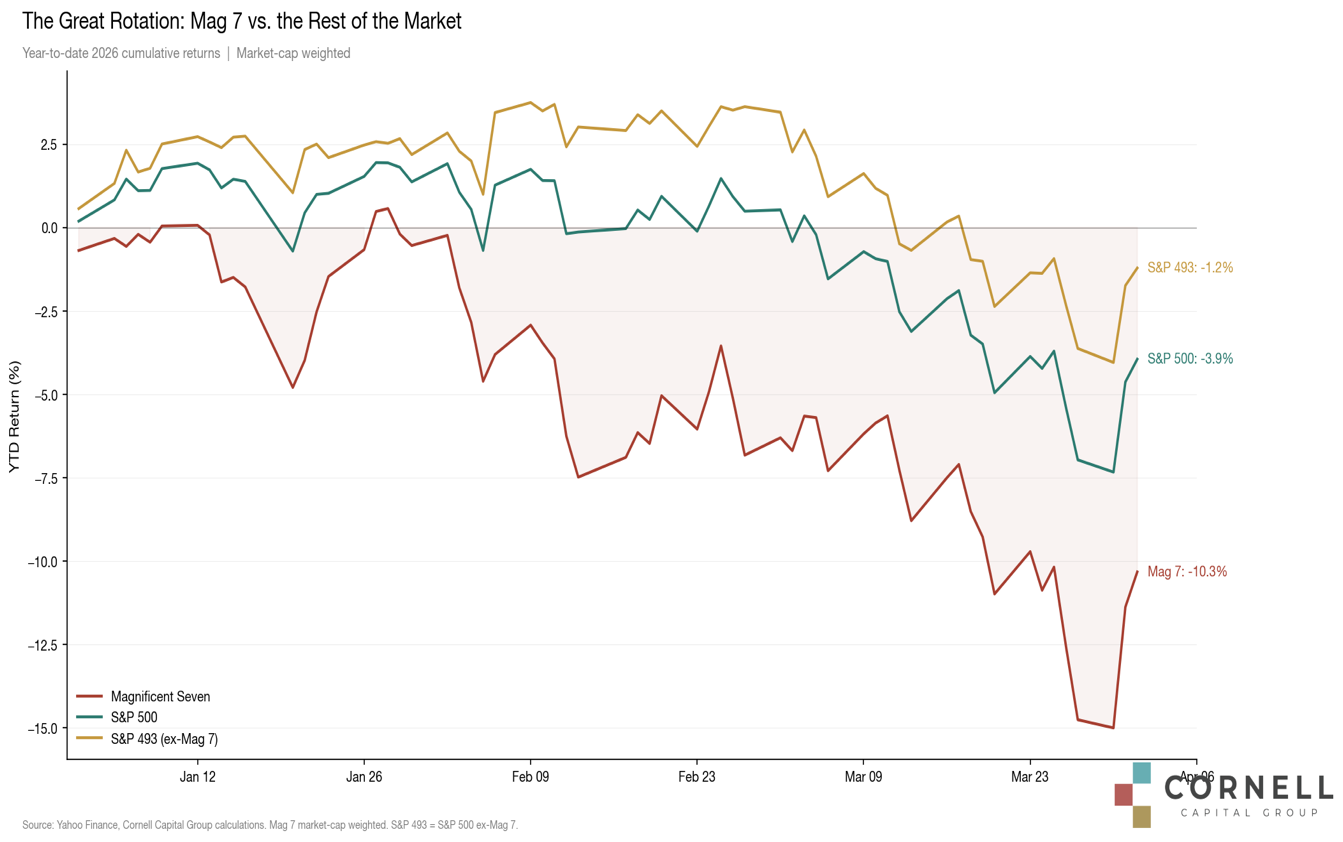 The weakness in the headline indices masks a more concentrated dynamic: the market’s decline has been driven disproportionately by the unwinding of the “Mag 7” — mega-cap technology leaders that had previously powered the bulk of index returns. As these stocks have pulled back — reflecting valuation sensitivity, rising capital intensity around AI, and policy uncertainty — their sheer weight in the indices has dragged the overall market lower. Overall, the S&P 500 fell 3.9%, pulled down by the Mag 7’s collective 10.3% decline. Beneath the surface, however, many sectors proved far more resilient: energy rose 36.5% in response to the oil shock associated with the Iran war, underscoring that this is less a traditional bear market and more a repricing of leadership at the top of the market.