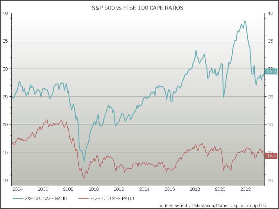 The run-up in U.S. stocks during the first half of the year has further expanded the gap between their valuation and the valuation of stocks in the rest of the world. For example, the chart below compares the CAPE ratios for the S&P 500 against the same measure for the UK’s FTSE 100.