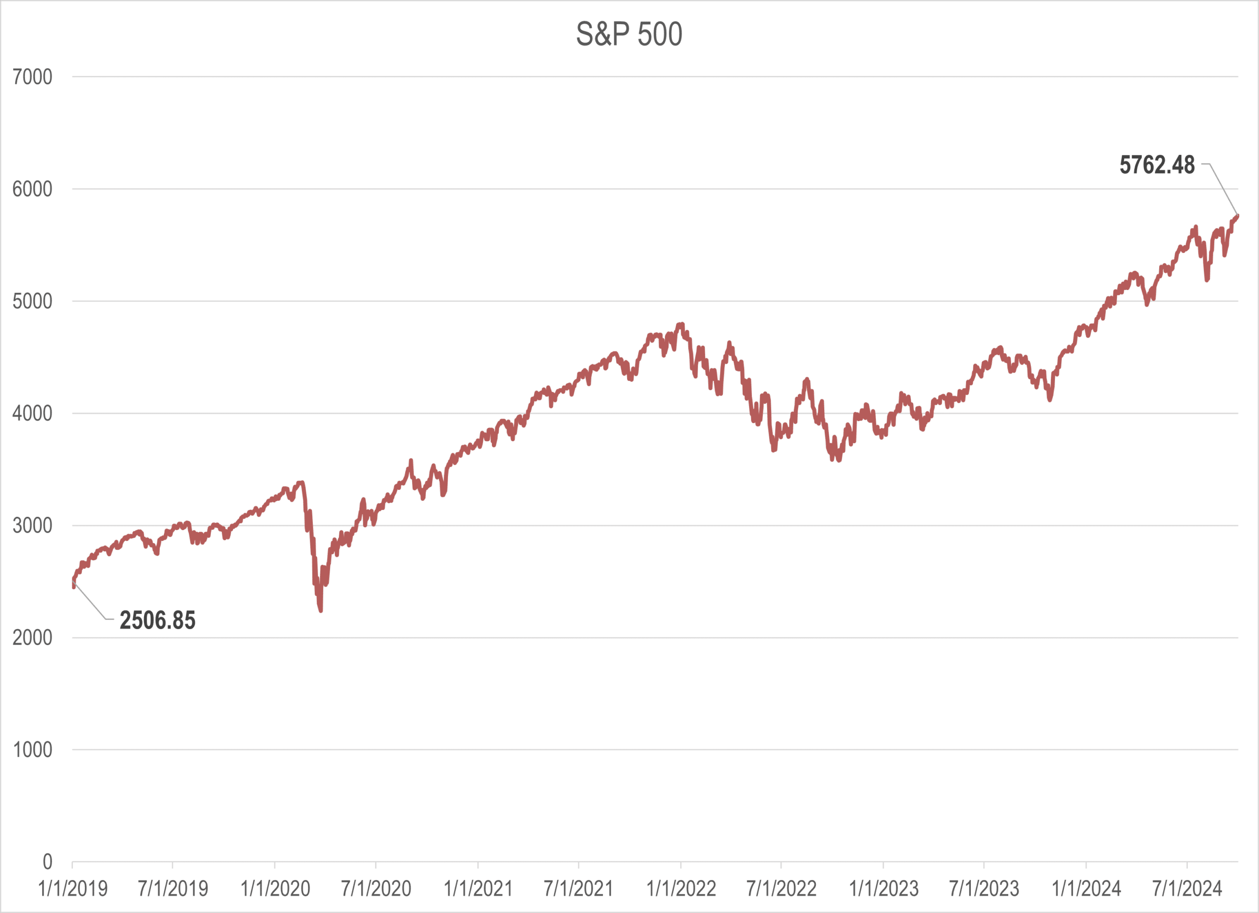 As shown in the chart below, on January 1, 2019, the S&P 500 index stood at 2506. By the market close on September 30, 2024, the index had risen to 5762, an increase of 130% representing a compound growth rate of 15.6% per year.