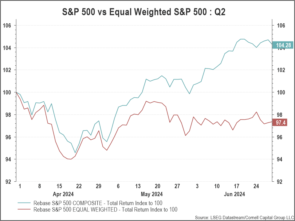 The widening gap was evident in Q2 2024 when the standard index rose 4.3% while the equal weighted index fell 2.6%.