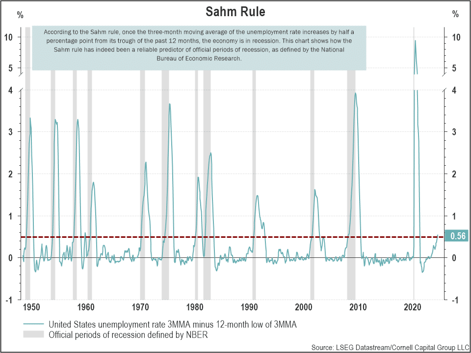 In our Q2 memo we noted that recession signals continued to flash. We focused on two indicators in particular, the slope of the yield curve and Sahm rule. We noted that “These indicators should be taken with a grain of salt. Perhaps this time will be different, and the economy will avoid a recession. But it would be foolhardy to ignore them entirely. They are yet another reason, along with stretched valuations, to follow a conservative, low-risk, investment strategy.”