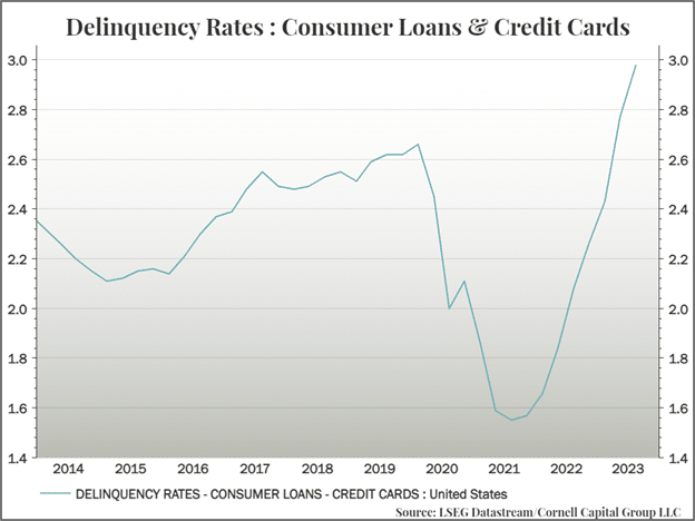 The third indicator is delinquency rate on consumer credit card loans. Consumers played a large role in promoting economic growth in 2023. The rate of delinquencies suggests that the consumer tailwind will diminish, or even reverse, in 2024. Given that the market seems to have priced in continued economic growth in 2024, a slowdown in consumer spending would likely come as a shock to most investors resulting in a drop in stock prices.