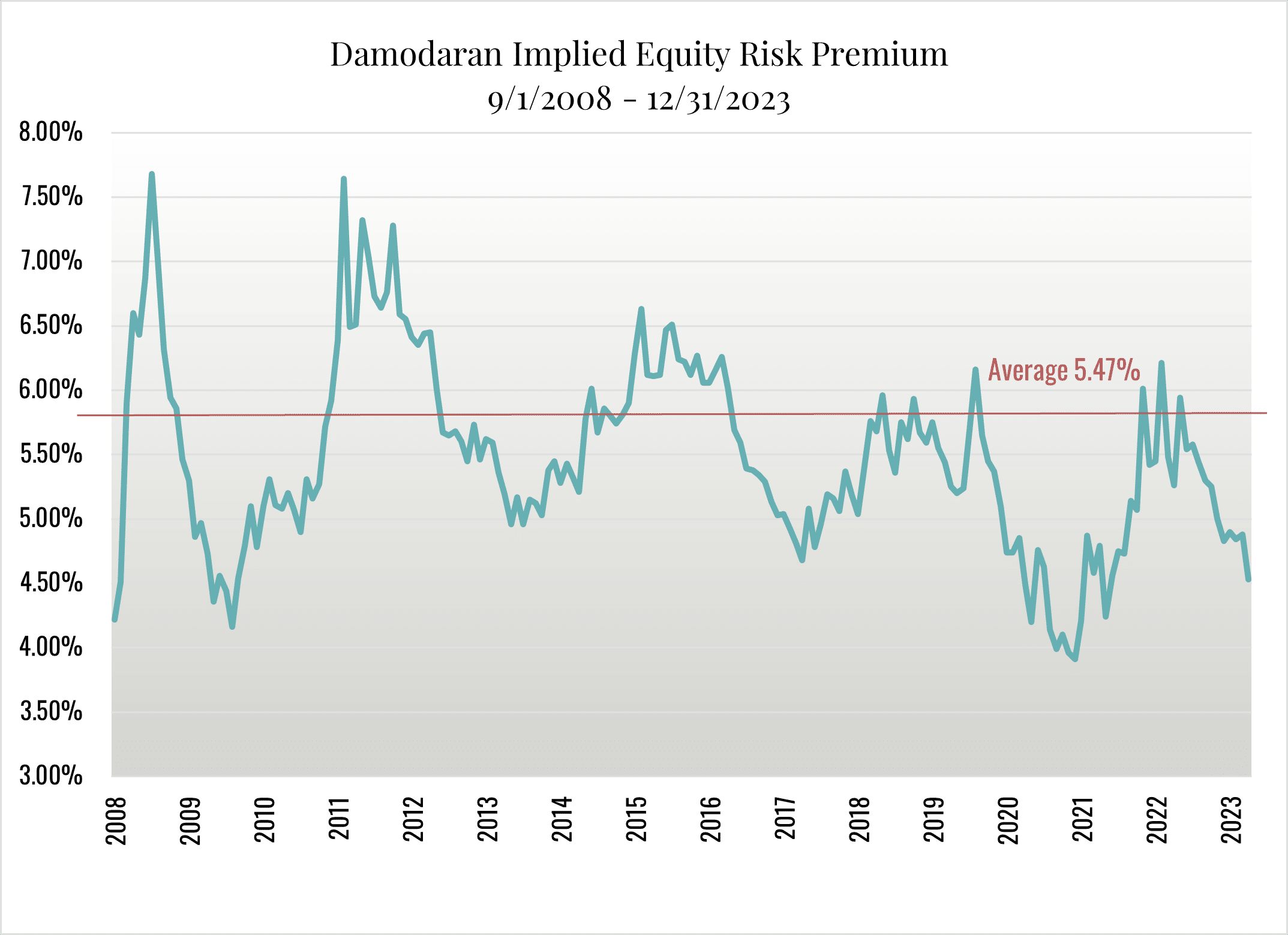 long-run average and produced the chart above which is extended through December 31, 2023. As it shows, the implied equity risk premium fell from 4.84% on October 1, 2023 to 4.53% on December 31, 2023. Only twice in the previous twenty years has it been this low.