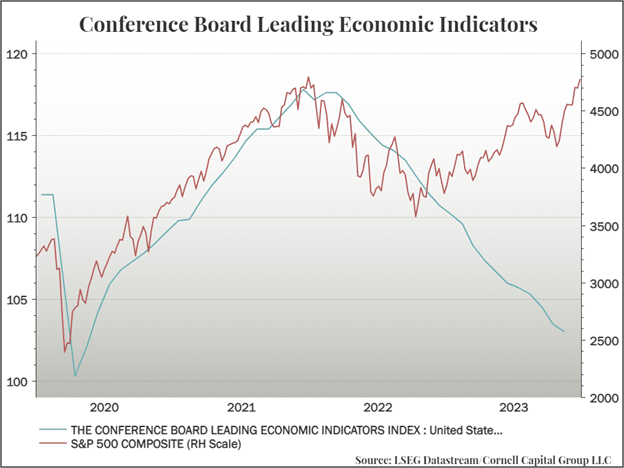The next indicator is the Conference Board’s Leading Economic Indicators Index. Typically the index moves with the stock market, in part because the S&P 500 is one of the components of the index. That comovement is evident in the chart up through mid-2022. But at that point the leading indicators continue to decline while the market turns up. One wonders how long this divergence can continue. For the gap to close either the leading indicators must improve or stock prices must fall. We fear the latter is more likely.