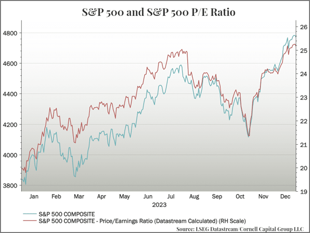 If movements in market prices are due to changes in the equity risk premium, as opposed to rising earnings, then the P/E multiple will expand. This is exactly what happened during the 2023 run-up. As the next chart shows, virtually the entire increase in the S&P 500 can be attributed to a rising P/E multiple. During the fourth quarter, the P/E ratio and the level of the market moved in virtually lock step. Going forward into 2024, the only way for that multiple to expand further, holding expected growth in earnings constant, is for the equity premium to continue to decline. We think this is highly unlikely.