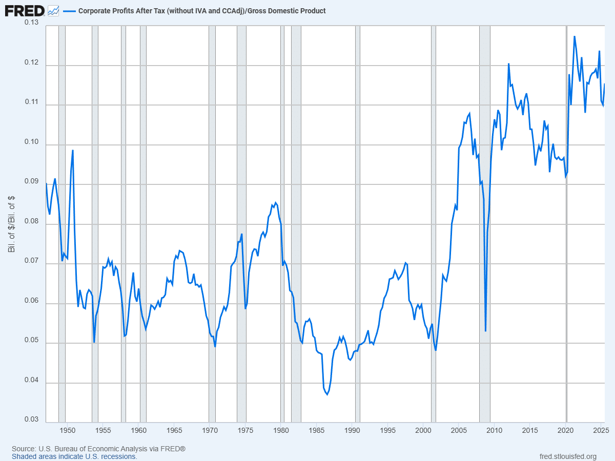 Corporate profits already sit near historic highs as a share of GDP, and political as well as economic pressures are mounting. Holding today’s elevated profit share will be difficult; expanding it further appears highly unlikely.