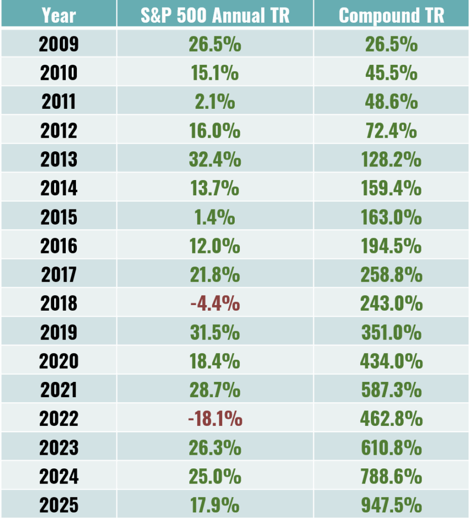 The past seventeen years have delivered extraordinary returns for U.S. equity investors. The S&P 500 rose 954.5% from 2009 to 2025 — a performance far exceeding what most rational valuation frameworks would have predicted at the start of the period.