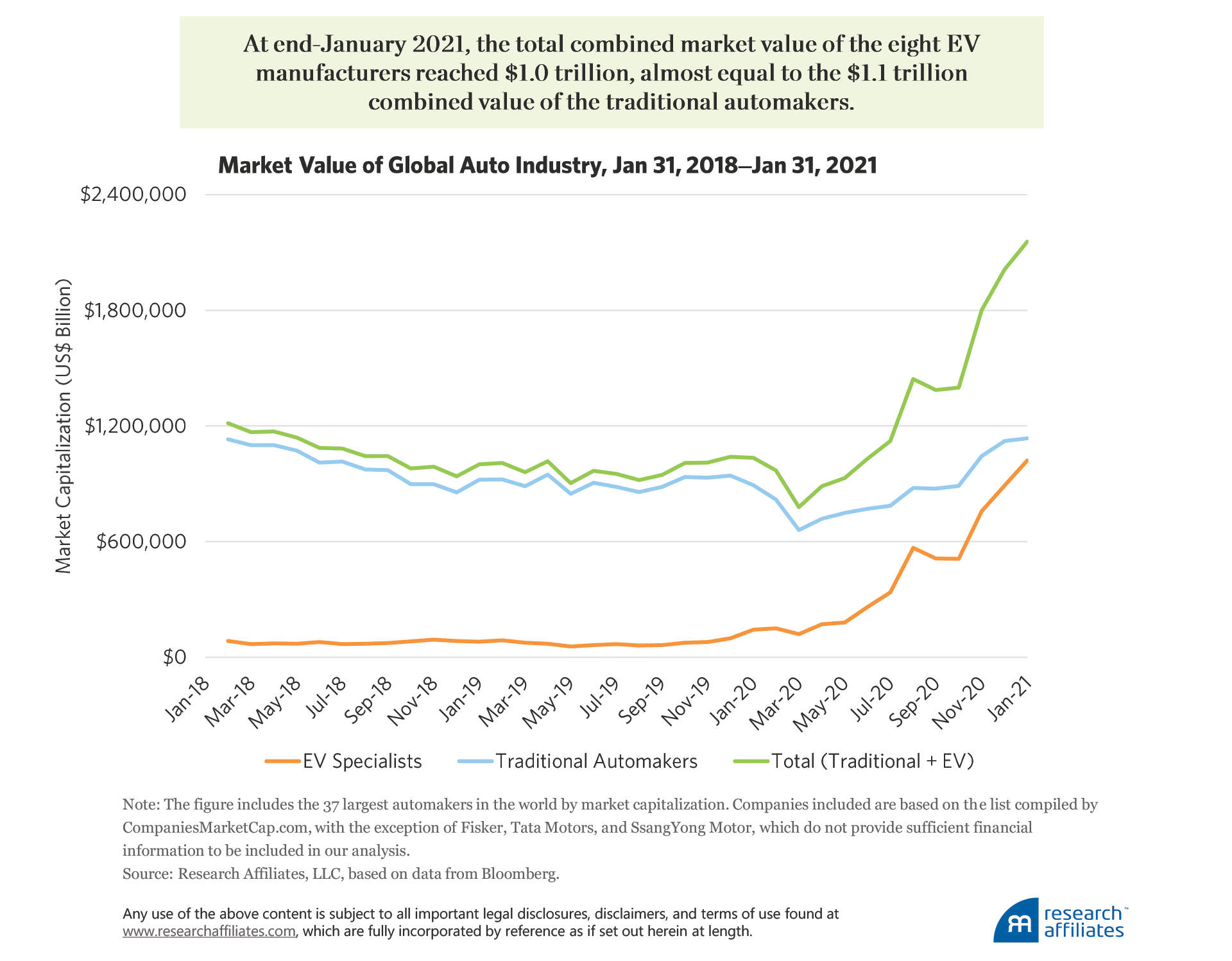 The year 2020 was a spectacular year for the auto industry in terms of valuation appreciation, as EV specialists became the market’s latest beloved companies and led a remarkable price run-up. As of January 31, 2021, the total market value of the eight EV specialists in our universe was $1.0 trillion, after year-over-year growth of 618%, almost on par with the $1.1 trillion combined value of traditional automakers.