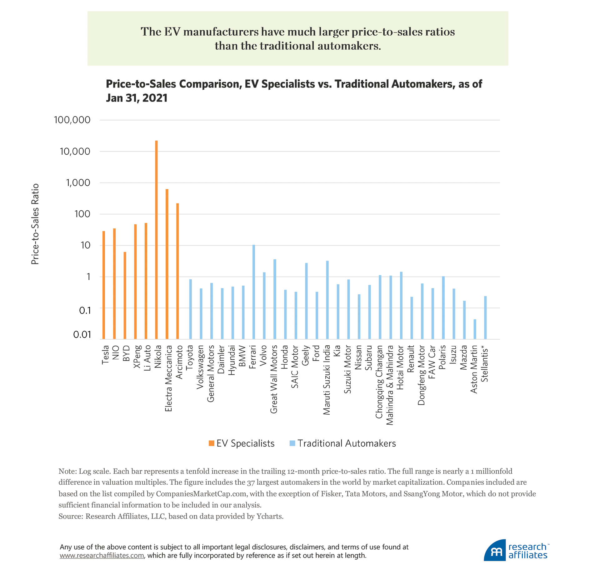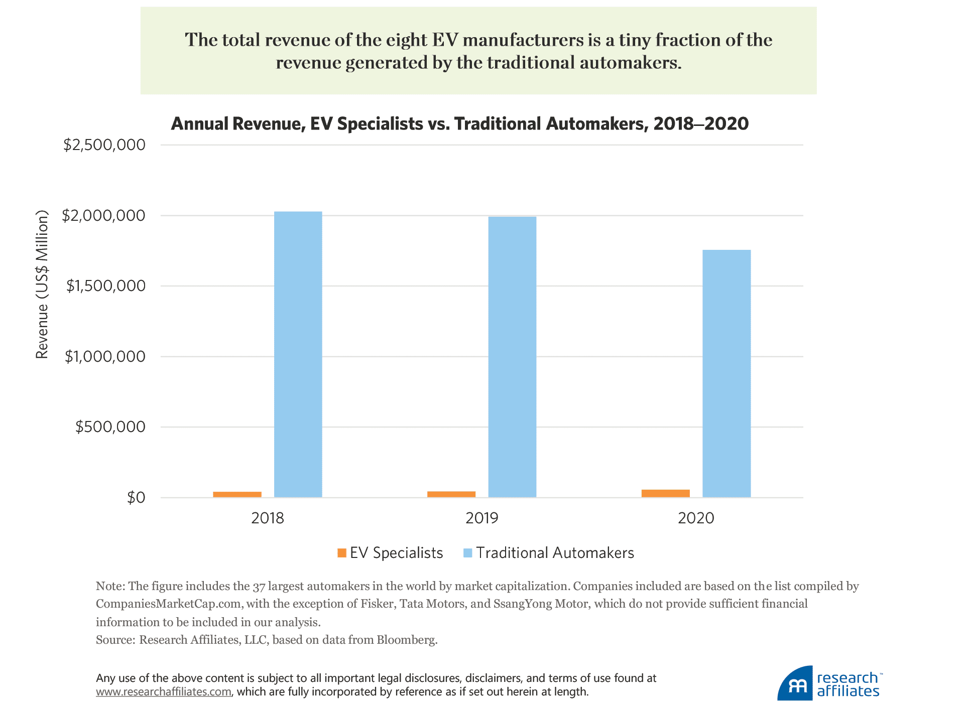 - We started with a list of the 40 largest automakers in the world by market capitalization as provided by CompaniesMarketCap.com and divided them into two groups: electric vehicle specialists (EV-focused) and traditional automakers. Our analysis does not include Fisker, Tata Motors, and SsangYong Motor because they do not report sufficient financial information for our study period.