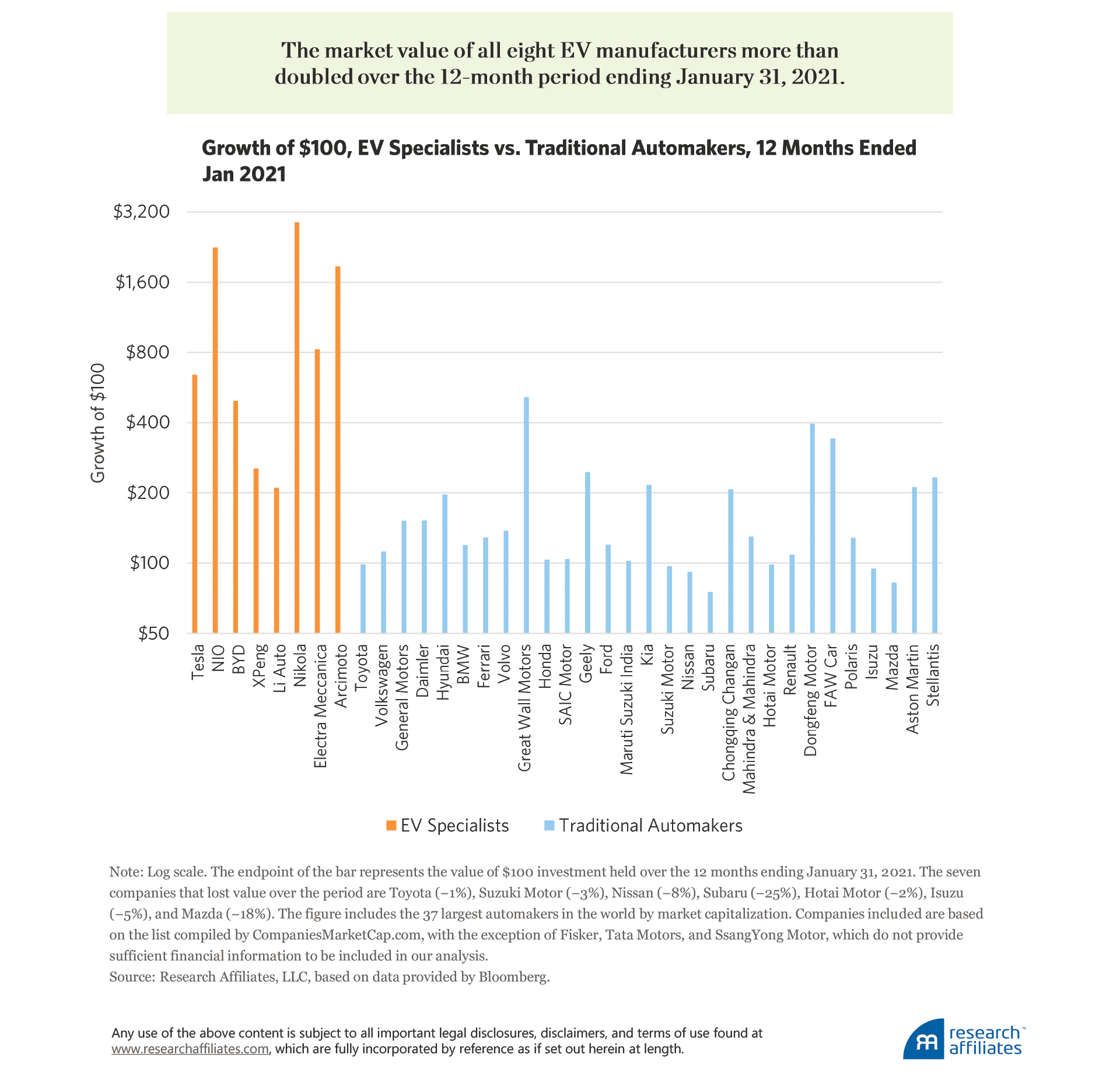 Let’s compare the growth of $100 over the 12 months ended January 31, 2021, if invested in each of the largest public auto companies by market capitalization.6 Seven conventional automakers lost market value (or more accurately did not fully recover losses from the COVID crash),7 while the market value of eight traditional automakers more than doubled.8