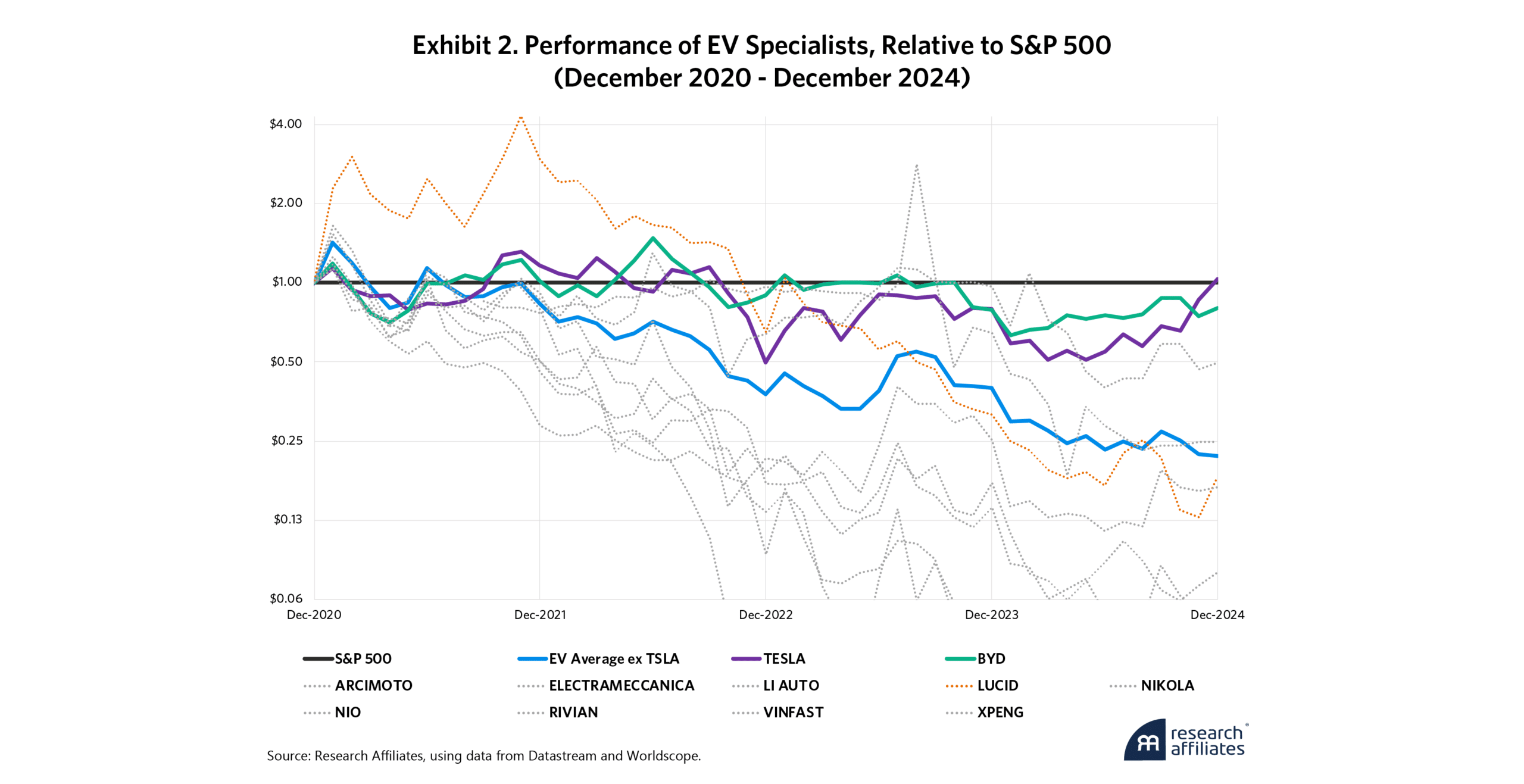 An investor who equally weighted Tesla and the eight other EV specialists from our early-2021 study would have finished 2024 nearly 80% poorer than one who had simply put their money in the S&P 500. Besides Tesla, BYD was the only EV specialist that would have left an investor with even half the wealth of an S&P 500 index fund investor. BYD was also the only EV specialist in early 2021 with a price-to-sales ratio below 10x. The numbers don’t lie: Price matters.
