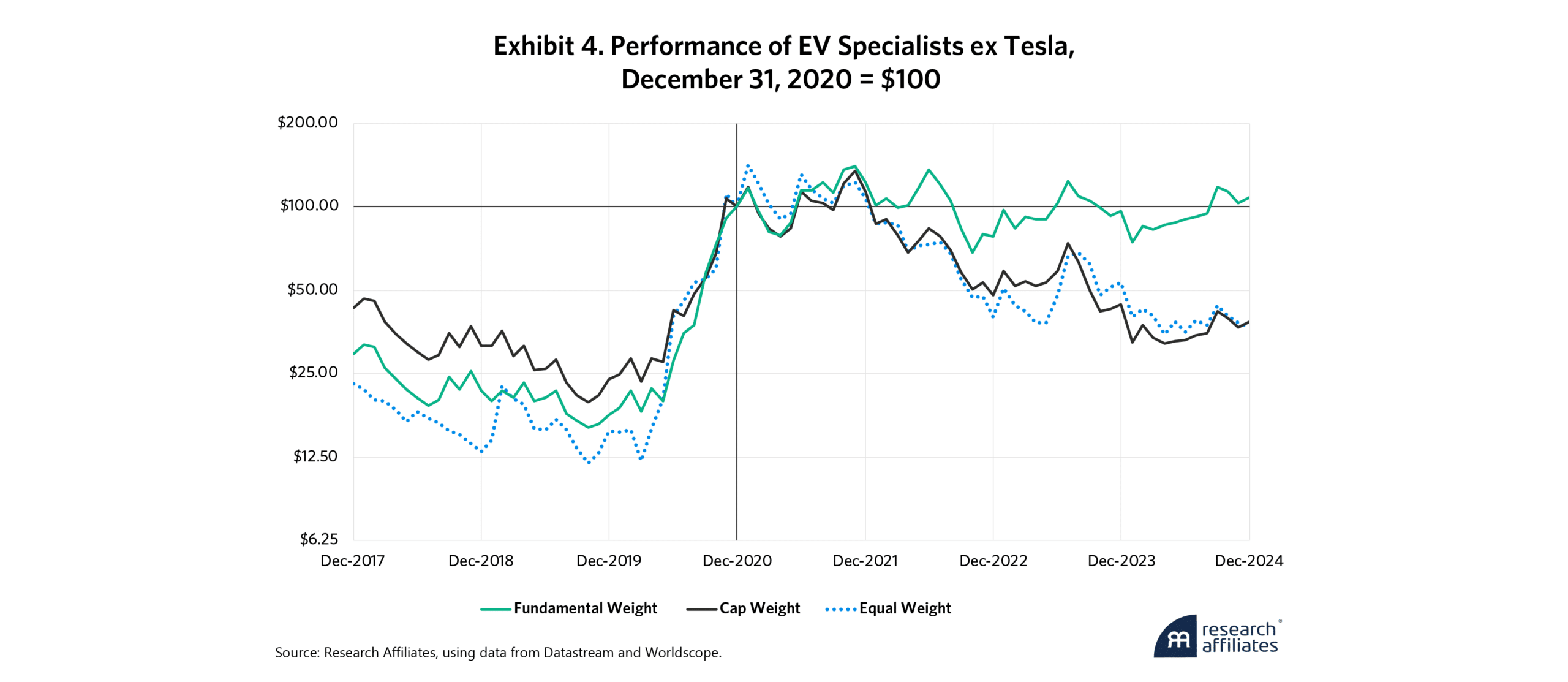 The fundamental-weight portfolio (dotted green line) also peaks at around $140 in 2021 but exhibits more resilient performance than its equal- and cap-weighted counterparts through 2024. It trended to a low of about $70 in October 2022 before recovering to nearly $110 at year-end 2024, for an almost 10% return since December 2020. While hardly a world beater amid the S&P 500’s robust performance, the fundamental EV portfolio was nearly twice as valuable as the other two portfolios at the end of the sample period.