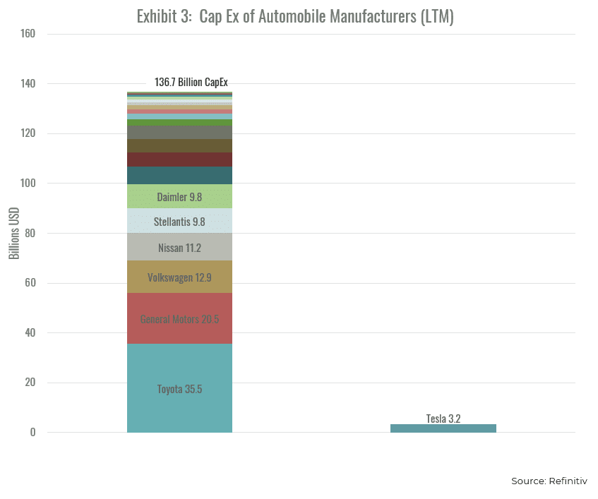Further insight into the role played by electric vehicle specialists can be gained by examining the long-run performance of market capitalization for the industry. Exhibit 2 plots the Thompson Reuters Global Auto & Truck Manufacturers Market Capitalization index from November 2011 to November 2021. From November 2011 through the onset of Covid, the index bounces around the average level with no noticeable trend. This is consistent with the view that the market capitalization was simply tracking invested capital with little in the way of value creation. However, following the Covid market bottom the index takes off and rises almost four-fold, an increase unprecedented from the perspective of the preceding decade. That increase is due almost entirely to three factors. First, the appreciation in value of pre-existing electric vehicle specialists, primarily Tesla. Second, the entrance of new, highly valued, electric vehicle specialists such as Nio, XPeng, and Lucid. Third, appreciation in the stock prices of traditional manufacturers based on their stated plans for the future production of electric vehicles. In short, the stock market is saying that value creation in the automotive industry is almost entirely associated with the actual or proposed manufacture of electric vehicles.