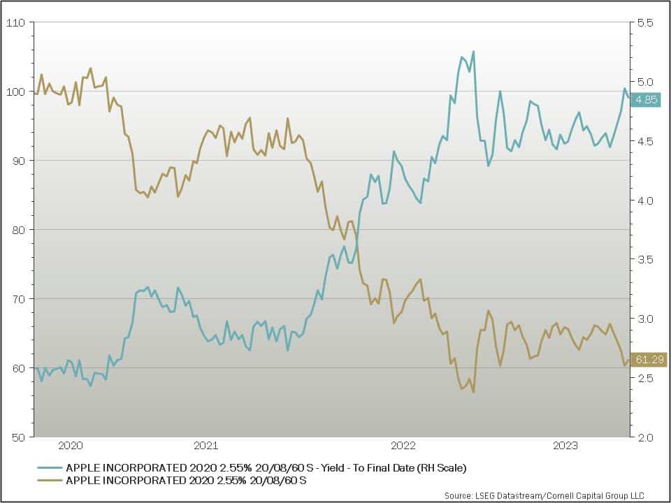 So let’s start with Apple bonds. In 2020, Apple issued a 40-year bond that matured in 2060 with an interest rate of 2.55%. At that time, that was the market interest rate on very long-maturity, very low-risk bonds. And Apple’s bonds are virtually risk-free. Some would say even less risky than US government bonds because of Apple’s huge equity base and the continuing demand for all their products.