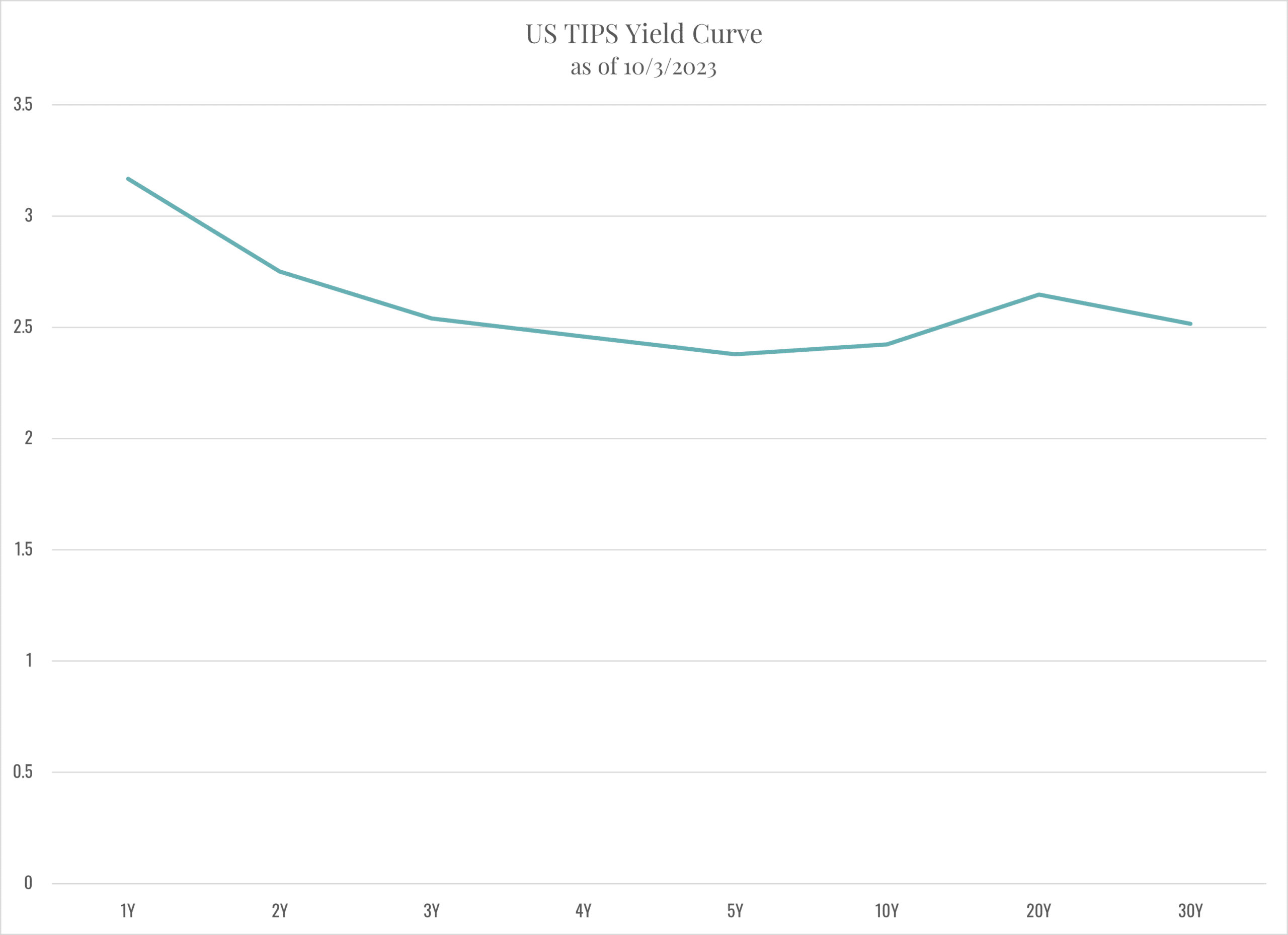 The final chart here shows the term structure of US Treasury real returns on their TIPS. And it’s interesting: it’s a little highest at the short end right now, at about 3% at one year. But once you get to two or three years, it’s two and a half percent, and it’s two and a half percent all the way out to 30 years. So, depending on your horizon, Treasury inflation-protected securities are something you might want to consider because you would be sure of achieving a real return of about 2 and a half percent.