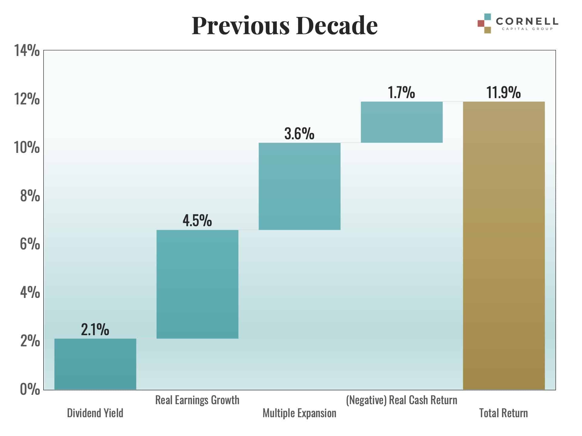 So, if we go back to the prior decade, the decade ending December 31, 2003, it was a remarkably good decade. The excess of cash return on stock was 11.9%, making it one of the best decades in history. And here’s how that broke down, and these numbers come from Dr. Brooks: The dividend yield averaged over the decade 2.1%. The real growth in earnings was 4.5%, which is actually a good deal above the very long run historical average. Earnings growth in the past decade was robust, but this dividend yield and earnings growth picked up a tailwind in the form of expansion of the price-earnings multiples. The multiple ended the decade well above where it started, and that translated into a 3.6% per year increase in stock prices. And finally, the real return on stocks, which we’re supposed to subtract out—excuse me, on cash, which we’re supposed to subtract out—was minus 1.7%. In other words, cash instruments like treasury bills and commercial paper had a negative return after adjusting for inflation. So, we’re subtracting a number that is negative. Two negatives make a positive, and the negative return on cash balances translated into a 1.77% addition to the excess of cash returns on stock. You add all of these up, and you get a decade with an 11.9% excess return.