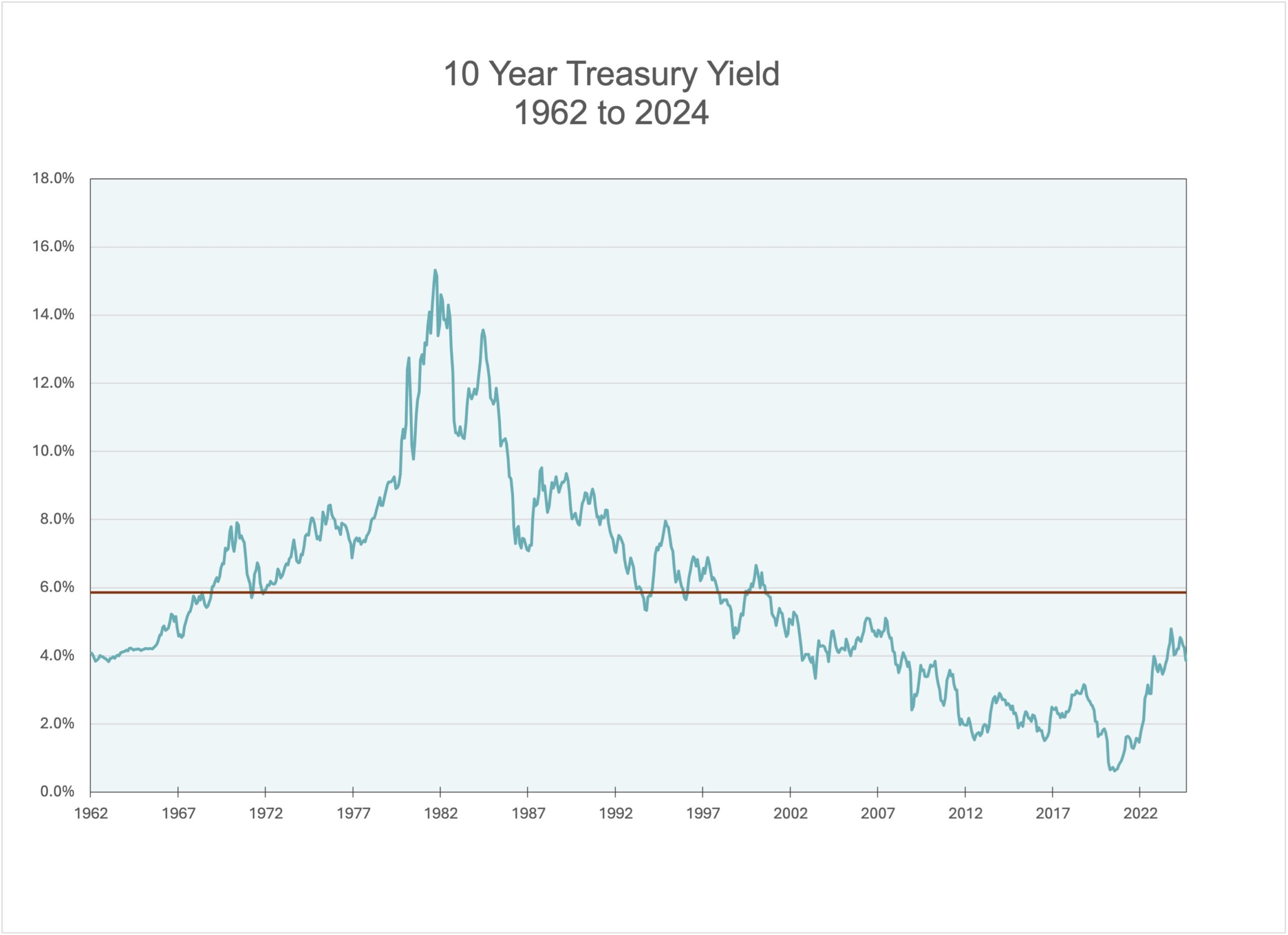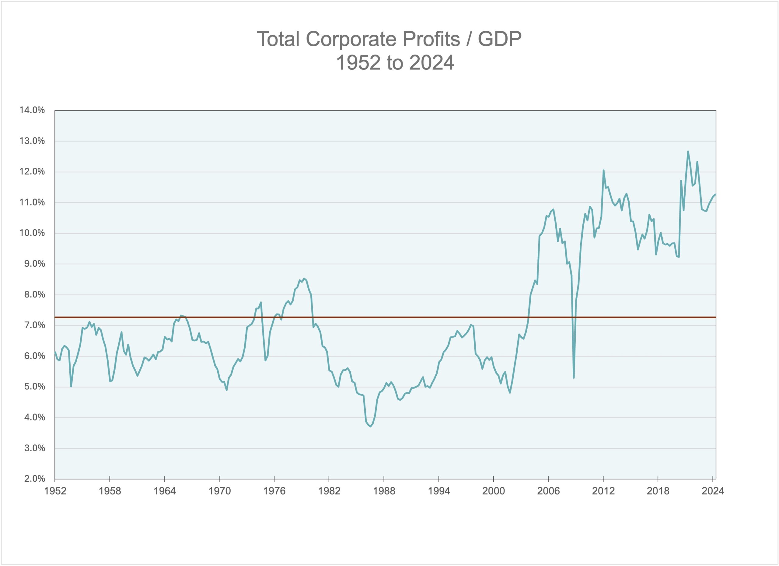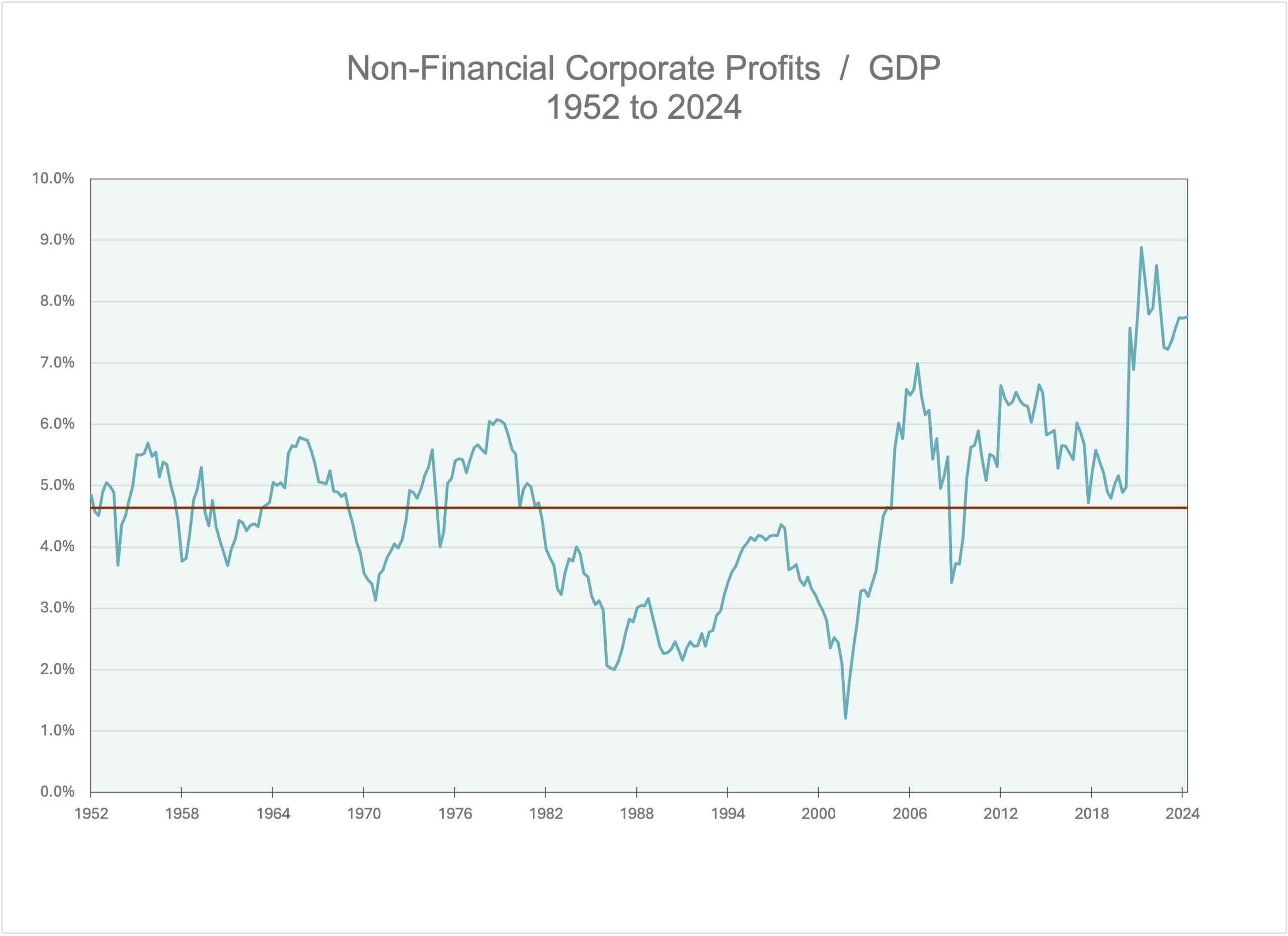 So, let’s start with interest. This chart shows the yield on the 10-year government bond over the period from 1962 to 2024. Notice that during the current period, interest rates were extraordinarily low relative to the historical sample. So, corporate profits were boosted a great deal by low interest costs. But at the very end here, with the recent Fed tightening and the improvement in the economy, interest rates have risen. This is unlikely to be much of a driver going forward, but it does explain the explosion in corporate profits more recently.