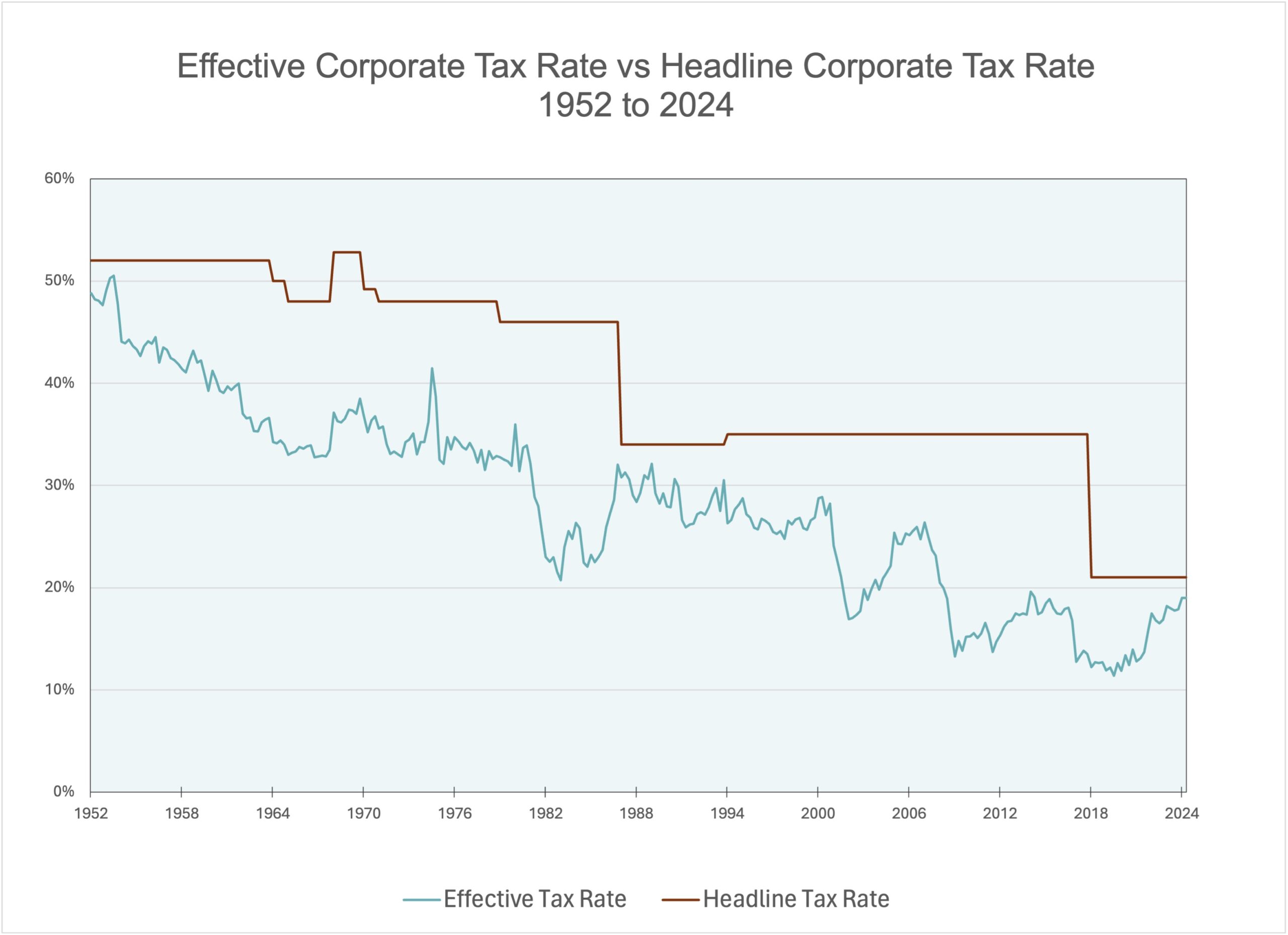 The other element is taxes, and that’s shown in this chart in two ways. The red line is the headline tax rate—the stated federal corporate tax rate—which is currently 21%. But the Biden administration definitely wants to raise that, and Vice President Harris is on board. If she’s elected, that rate will go up. The blue line is the effective rate, because companies don’t often pay the actual stated rate—the effective tax rate tends to be less. But either way, you can see that recently, corporate taxes have been extraordinarily low by historical standards.