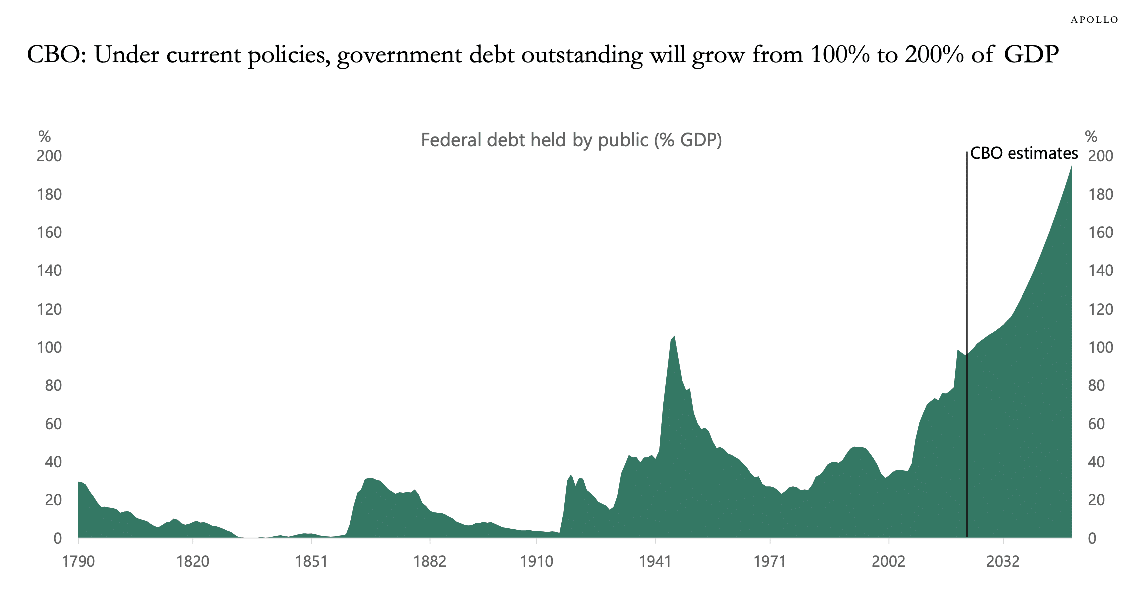 Currently, our debt stands at about $35 trillion, or 100% of GDP. According to the CBO, without significant policy changes, this figure is projected to rise to nearly 200% of GDP within a decade.