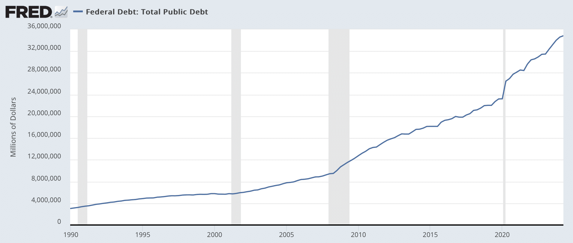 The first chart here shows the current federal debt in trillions of dollars from 1990 to the present. You can see an inexorable rise—not only is it rising, but in recent years, the curve has been getting steeper.