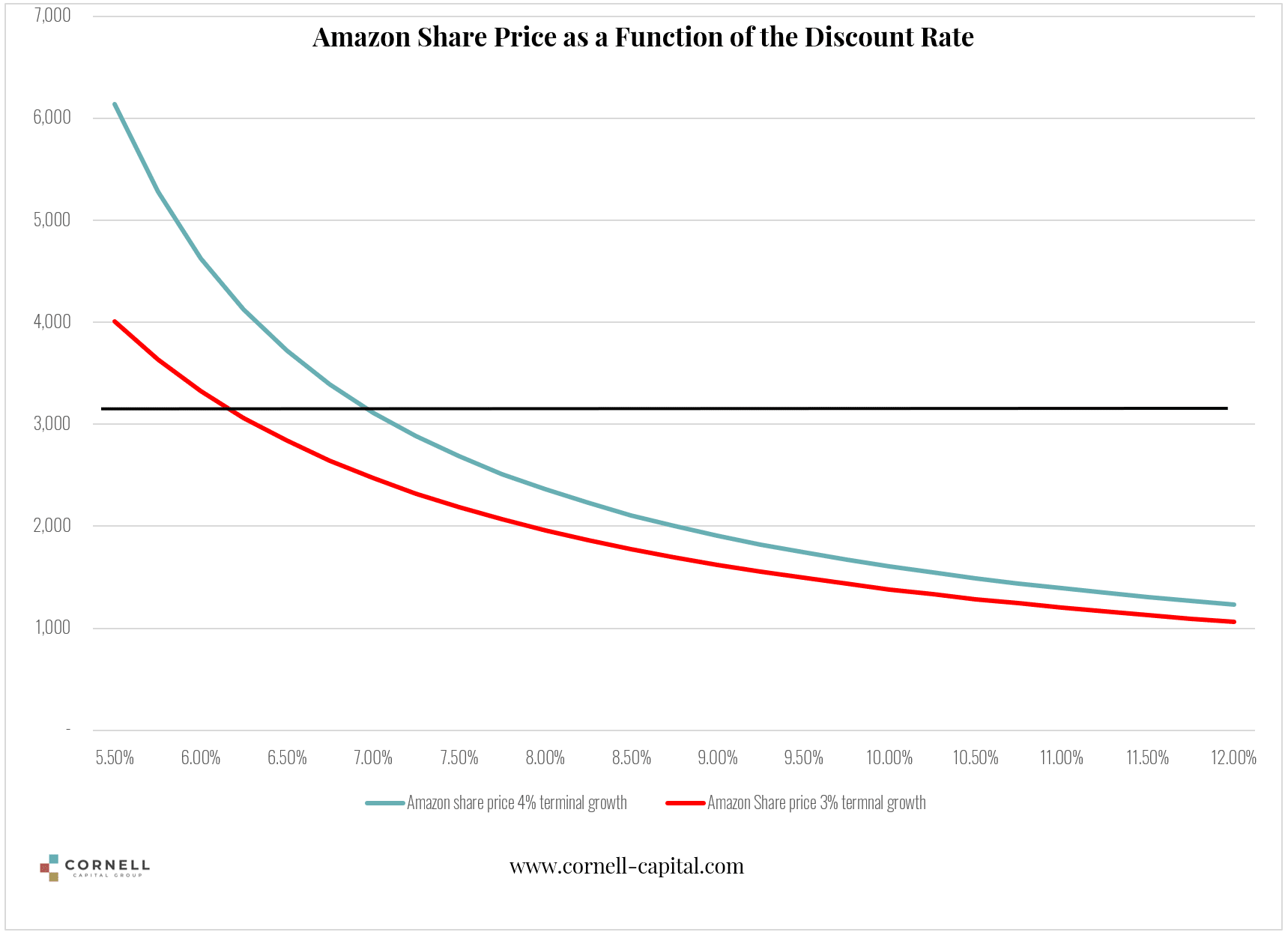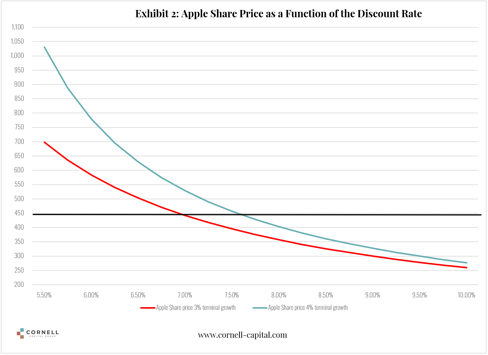 The results of the calculations are shown in Exhibits 2 and 3. The x-axis plots the discount rate and the y-axis the value. The black line shows the current stock price. The graphs show that although the current prices of Amazon and Apple are high, the implied discount