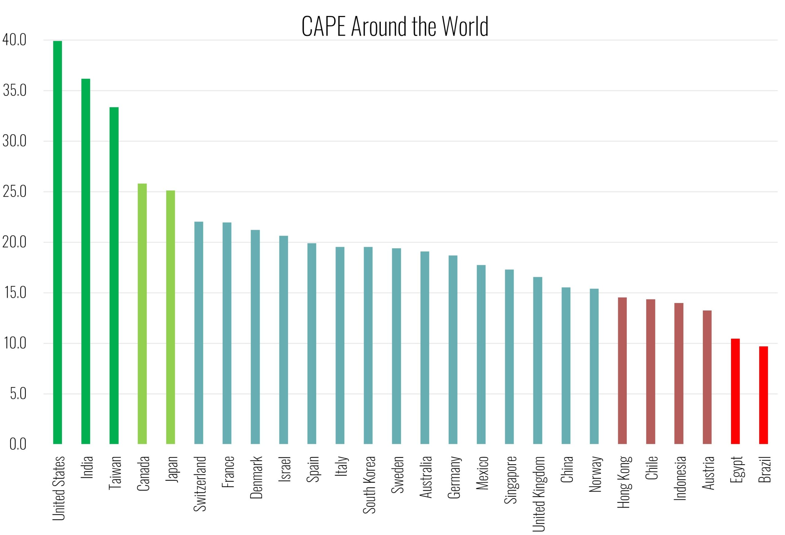 Further insight can be gained by looking at the CAPE around the world. The chart below shows the current CAPE around the world. There are several key takeaways: