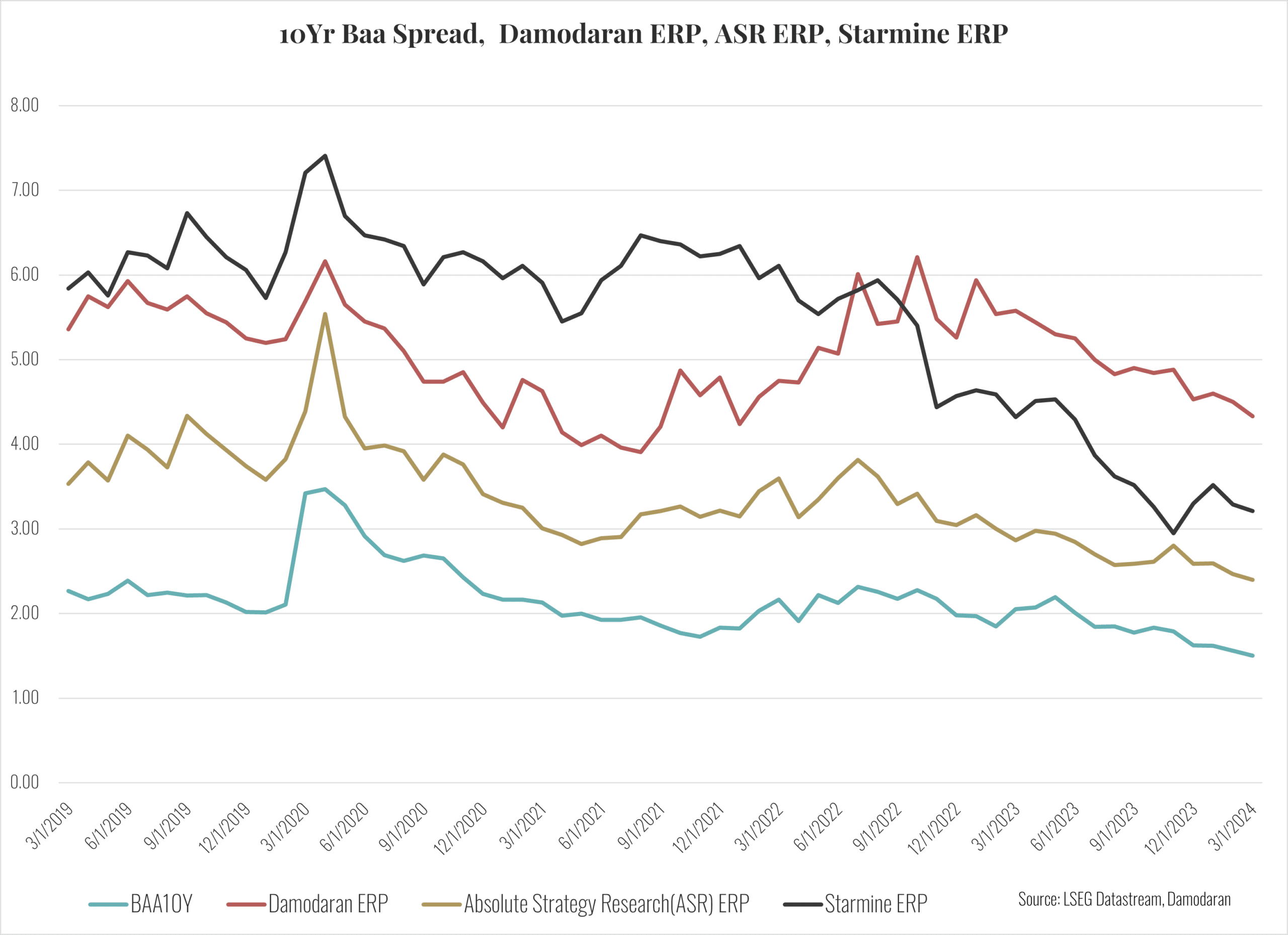 In our last two quarterly memos we stressed the importance of the equity risk premium for understanding the rise in stock prices. To estimate the equity premium, we used an approach advocated by Prof. Aswath Damodaran. While we think this is an excellent estimator, it is hardly the only one. Other estimates include those developed by Absolute Strategy Research and Starmine. In addition, there is no need to limit the analysis of risk premiums to the equity market. Credit spreads on fixed income securities of varying credit quality also provide information on risk premiums.