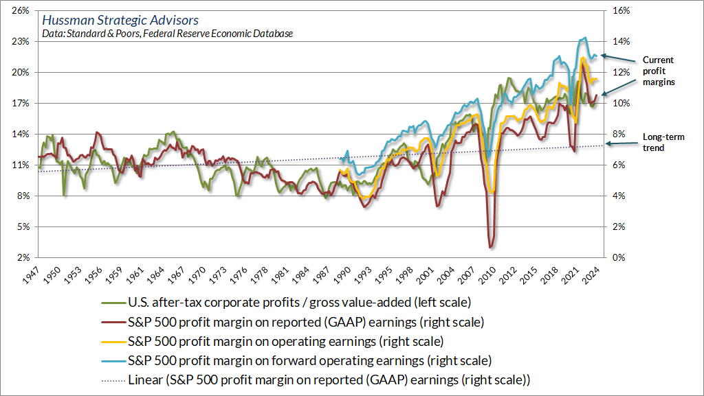 A similar picture emerges if we look at corporate profit margins as opposed to profits as a fraction of GDP. The chart below, taken from John Hussman’s latest memo, plots the corporate profit margins back to 1947 along with the long-term trend. No matter how they are measured, current corporate profit margins are near record levels and well above the long-term trend.