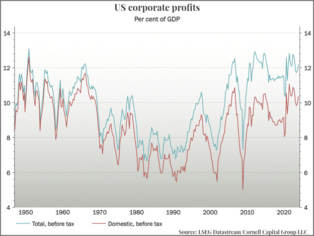 A big reason for the rise is corporate profits since 1980 are three big cuts in the corporate tax rates enacted during the administrations of Presidents Reagan, Bush, and Trump. The final cut by the Trump administration reduced rates a seventy-year low. Recently, however, political winds have begun to change, During the Biden administration effective corporate tax rates have risen and there is an active debate in Washington regarding further increases. Whether or not that occurs it is hard to imagine corporate rates being cut again, even if Trump is elected once again.
