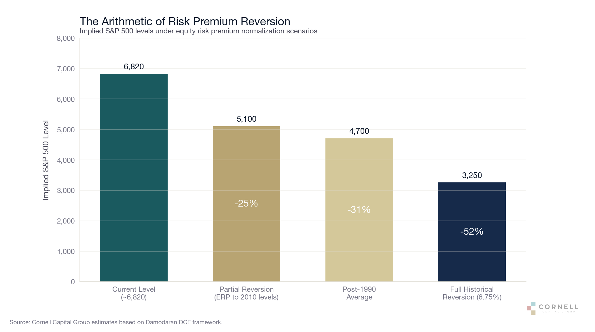 If today’s compressed premium persists, and earnings grow roughly in line with nominal GDP, expected equity returns over the next decade are likely in the 4–6% range. That is not meaningfully higher than what high-quality bonds currently offer — despite equities carrying substantially greater volatility and drawdown risk. If, however, the risk premium rises even modestly toward more normal levels, the adjustment must come through prices. A partial reversion — say, back to levels seen as recently as 2010 — would likely require a 25–30% decline in the S&P 500.