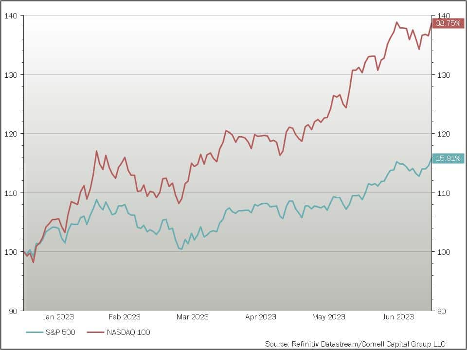 The market performance in the first half of 2023 was a surprise, to say the least. Whereas the year began with concerns about an impending recession, the market shrugged off those fears and moved dramatically upward as shown in chart below. The first half year increase in the S&P 500 was 15.9%, while the increase in the NASDAQ 100 was an astonishing 38.7%, matching half-year increases not seen since the 1980s.