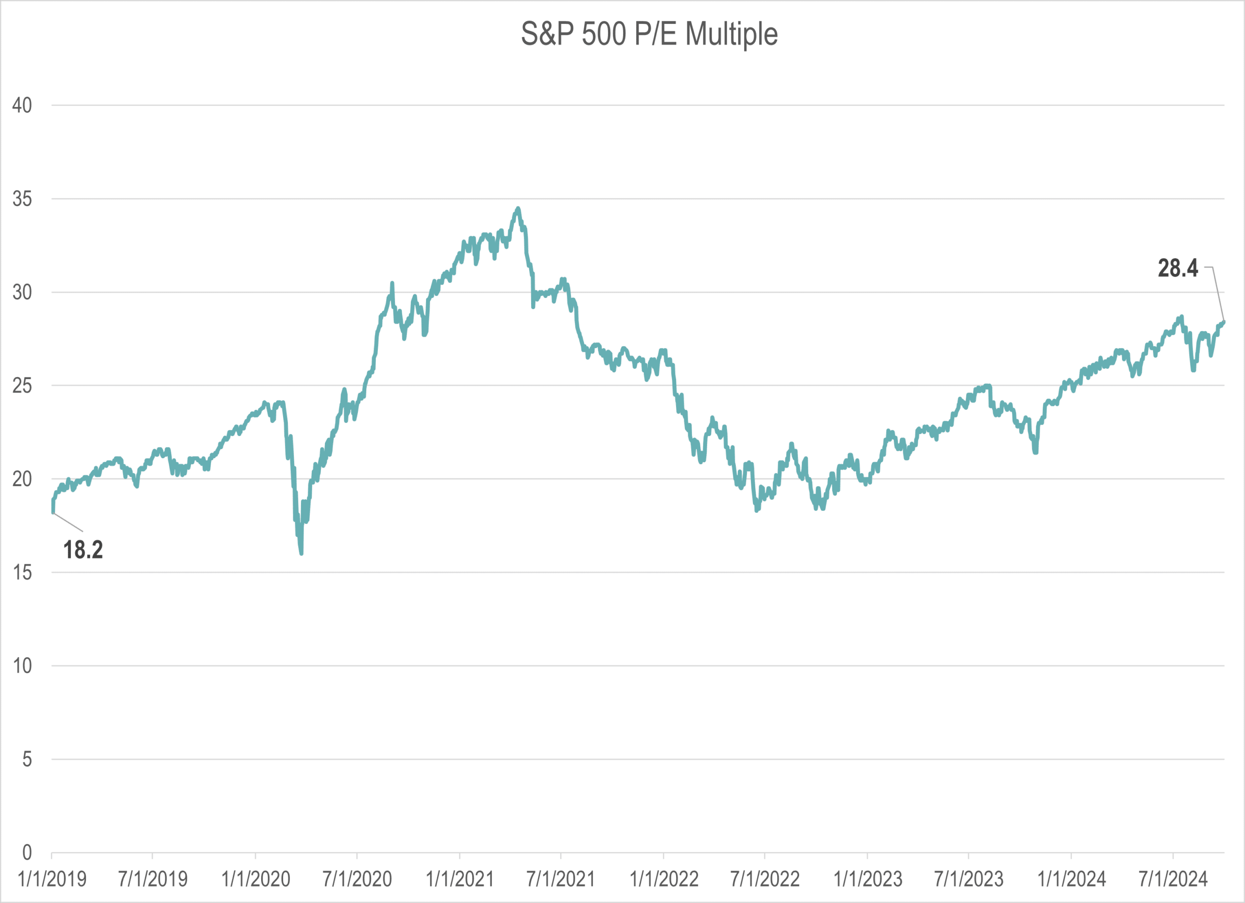 The third chart plots the P/E ratio. Over the period, it rose from 18.2 to 28.4, an increase of 52%, an annualized compound growth rate of 7.5%.