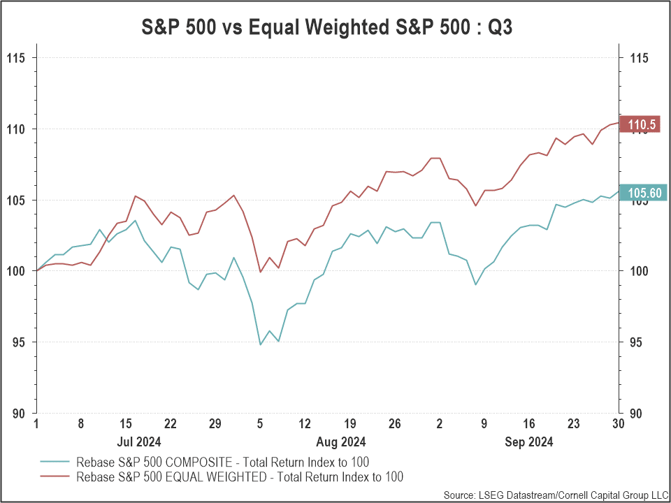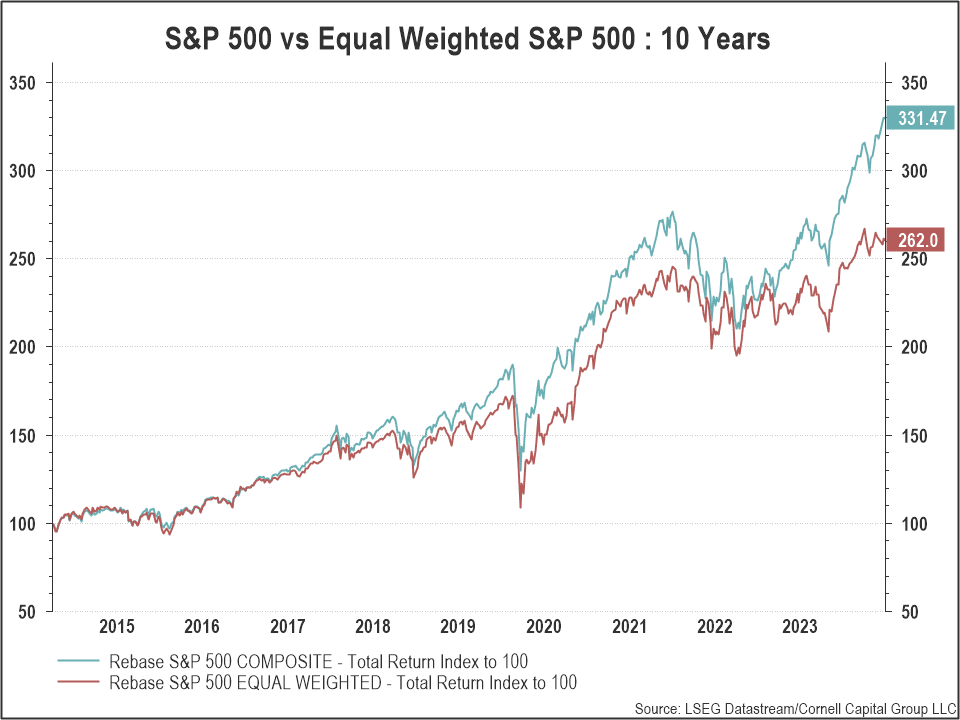 The widening gap was evident in Q2 2024 when the standard index rose 4.3% while the equal weighted index fell 2.6%.