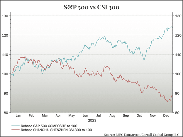 Finally, turning to an international perspective, there can be little doubt that from an investment standpoint the United States currently dominates China. The U.S economy is significantly outperforming China and investors in American companies do not face potential heavy-handed actions by the Chinese Communist Party that can affect the value of Chinese stocks. As is always the case in markets, however, investment decisions cannot be made without reference to prices. A run-down shack may be a better investment than a beach front mansion if the price differential is large enough. And as shown in the graph below, the price differential between American and Chinese stocks widened dramatically in 2023. One must ask whether it is reasonable to believe that this gap will widen further in 2024. If it does not, Chinese stocks, with all their blemishes may be superior investments to US stocks.