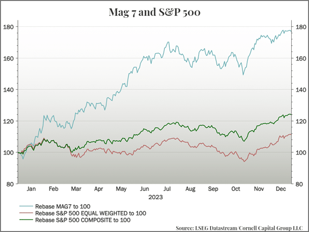 There is one other aspect of the run up in stock prices in 2023 that carries with it a unique risk. Much of the increase in the S&P 500 was due to the performance of seven stocks, the so-called Magnificent 7: Amazon, Apple, Google, Meta, Microsoft, Nvidia, and Tesla. This can be seen in the graph below. Although the S&P 500 ran up 24.8%, much of that gain was due to the Magnificent 7 who rose 76.6% and by the end of the year accounted for more than 30 percent of the index. In contrast, the S&P 500 equal weighted index, which gives little weight to the Magnificent 7, rose only 11.1%. Given their huge market capitalizations, it is hard to see the prices of the Magnificent 7 rising in 2024 anything like they did in 2023. This implies lower market returns overall in 2024.