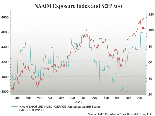 The fourth quarter of 2023 saw a dramatic switch in the behavior of active investment managers. The graph below plots the NAAIM index which measures the exposure of active investment managers to equities. By the start of the fourth quarter, the index was at a year to date low of 25. In the next three months, it skyrocketed to 102. Active managers went from a highly conservative position to going all in on equities. The risk is where can these manager go from there?