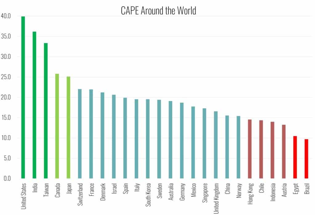 Further insight can be gained by looking at the CAPE around the world. The chart below shows the current CAPE around the world. There are several key takeaways: