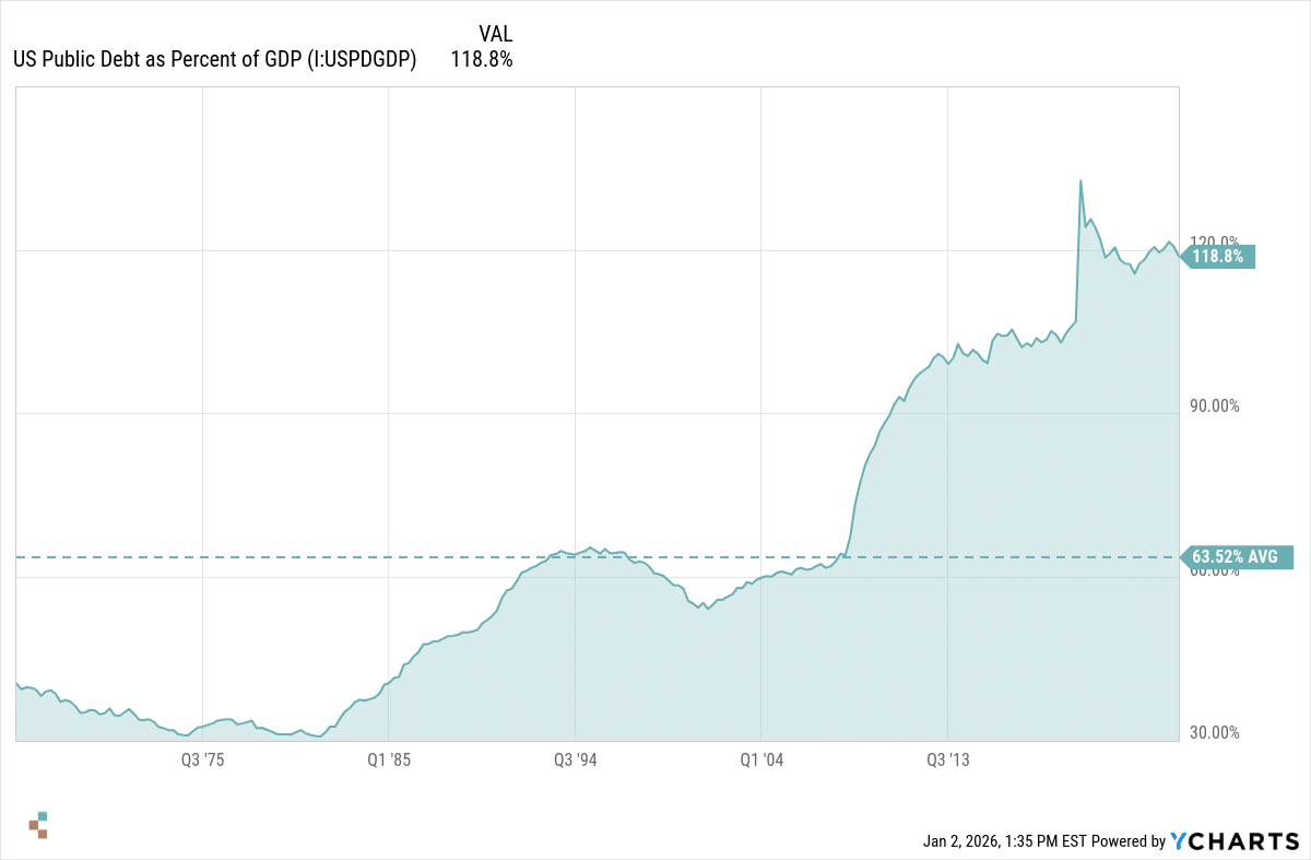 The chart below illustrates the first half of that story. It plots U.S. public debt as a percentage of GDP. Prior to the Global Financial Crisis, this ratio hovered around 60%. In response to the crisis, debt levels surged — and despite a long expansion and healthy GDP growth, they have continued to climb ever since. Today, U.S. public debt stands near 120% of GDP.