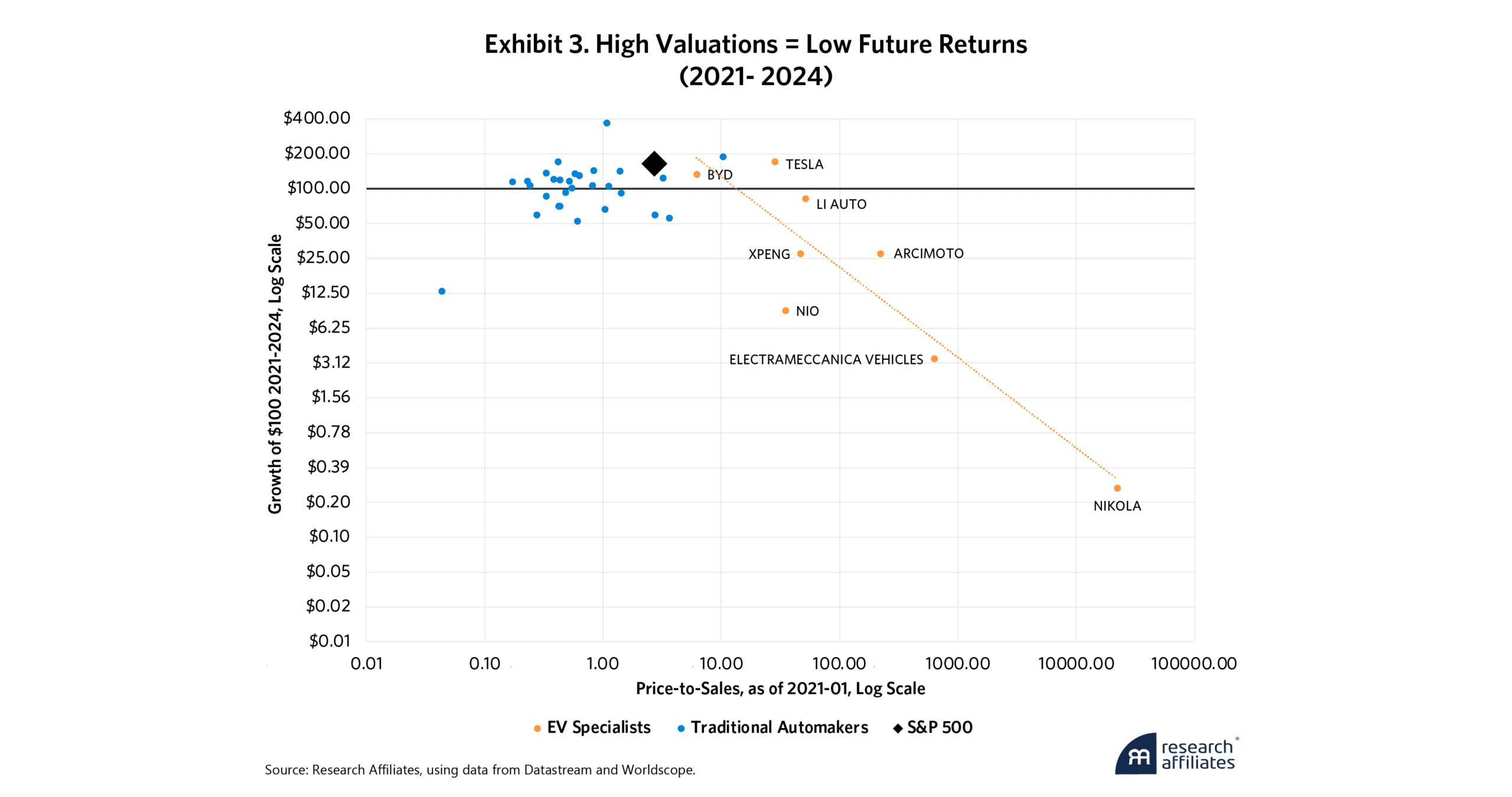 Exhibit 3 shows the relationship between starting price and subsequent performance among both traditional automakers and EV specialists. The scatter plot maps the price-to-sales ratios from our 2021 article (horizontal axis) against the growth of a $100 investment in each company from 2021 to 2024 (vertical axis), both shown in log scale. The divergence between EV specialists (orange) and traditional automakers (blue) paints a vivid picture.