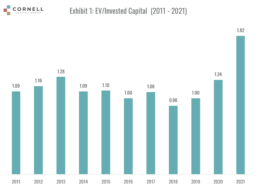 The exhibit shows that prior to 2020 the ratio bounced around its average of 1.08 with no observable trend indicating that the industry was only creating a modicum of investor value. (To provide perspective, the ratio for the software industry was 9.37 in 2020.) In 2020, however, the ratio rises to 1.24 and then it jumps all the way to 1.82 by November 1, 2021, well above its historical high-water mark.