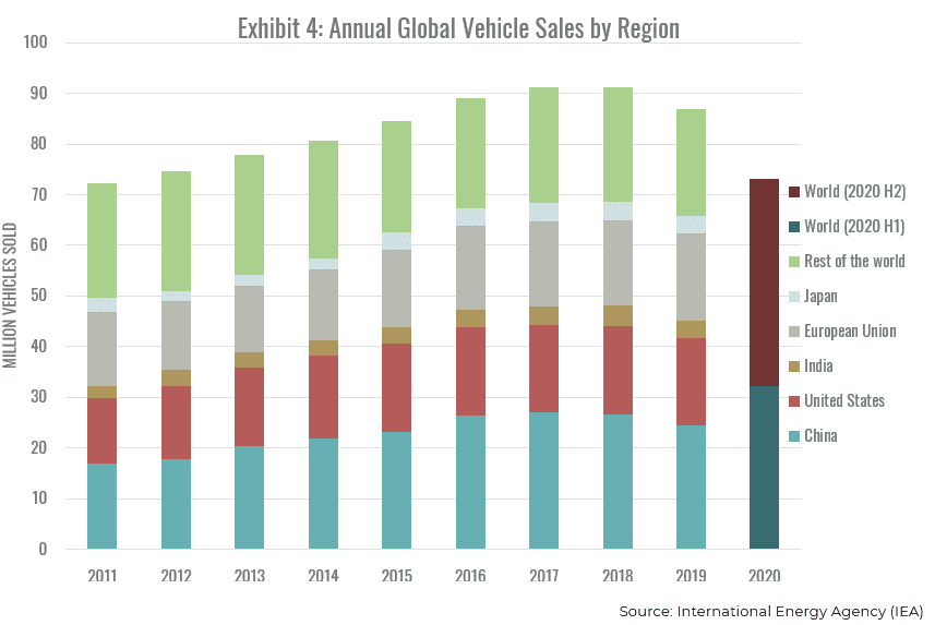 Playing devil’s advocate, if Tesla were going to become a dominant firm, as stock market seems to be saying based on its massive market capitalization, then that should be bad news for its competition unless the industry is exploding in the way that online video streaming did. That, however, is not the situation in the case of automobiles and light trucks. Exhibit 4 plots annual global unit auto sales from 2011 through 2020. Regional data is shown through 2019. In 2020 regional data is no longer available and the sample is divided into the first half and second half of the year.