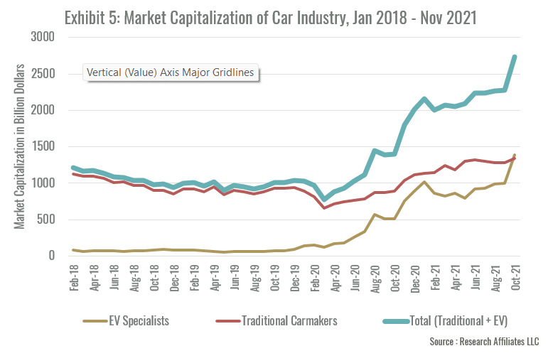 The industry sales data flies in the face of stock market performance. Not only has Tesla risen to become the fifth most valuable company in the world as measured by market capitalization, but the stock price of any company that has anything to do with electric vehicles has risen right along with it. As evidence, Exhibit 5 provides a close-up showing the recent appreciation in the market capitalization of the car industry during the period from January 2018 through November 2021. The exhibit does not include Rivian which would add more than $100 billion to the overall industry capitalization and to the EV specialists. Although most of the increase in industry value is due to EV specialists, the stock price of virtually every individual auto manufacturer rose reflecting stock market’s view that the transition to electric cars will lead to massive value creation throughout the industry despite slow growth in total unit auto sales.
