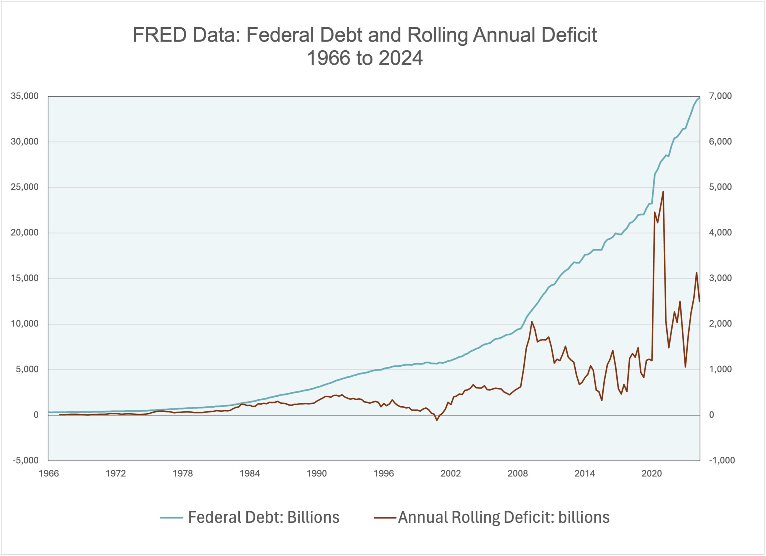 The final chart shows this. The blue line shows the federal debt, which has risen to $35 trillion. At that level, the interest on the debt is going to be a trillion dollars—greater than the defense budget or Medicare spending. The red line shows the deficits. Notice the deficits were small for many years, and during the Clinton administration, there was even a surplus in one year. But recently, they’ve exploded, and they’re running around $2 trillion. With the government required to borrow that much, it seems very unlikely that interest rates are going to come down much. It also seems likely that the government is going to look under the couch for added tax money.