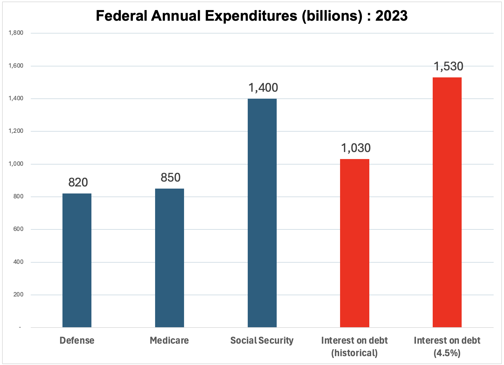 For example, if the federal government were paying 4.5% (roughly the current yield on both short- and long-term government securities) on its entire debt, interest payments would reach $1.5 trillion—exceeding Social Security expenditures.