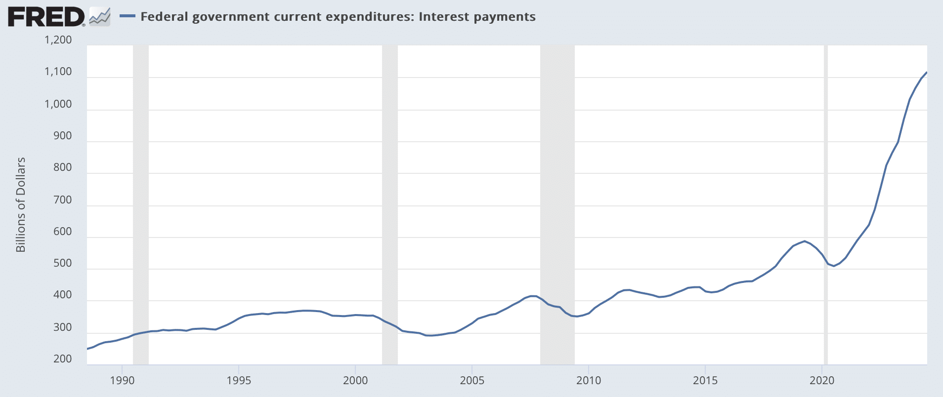 For an extended period, the curve remained relatively flat while rates were very low. But as interest rates have risen, and as the amount of debt has continued to grow, the interest payments have skyrocketed, reaching the $1.1 trillion level.